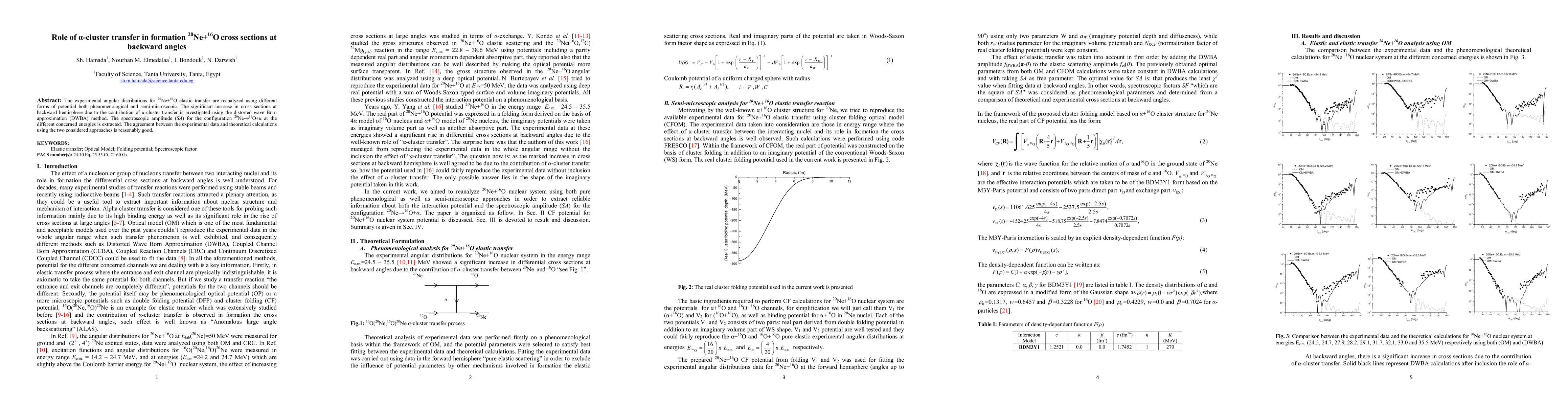 This paper reanalyzes the angular distributions for 20Ne+16O elastic scattering, focusing on the significant increase in cross sections at backward angles due to alpha-cluster transfer. Theoretical calculations using the DWBA method and different potential forms show reasonably good agreement with experimental data.