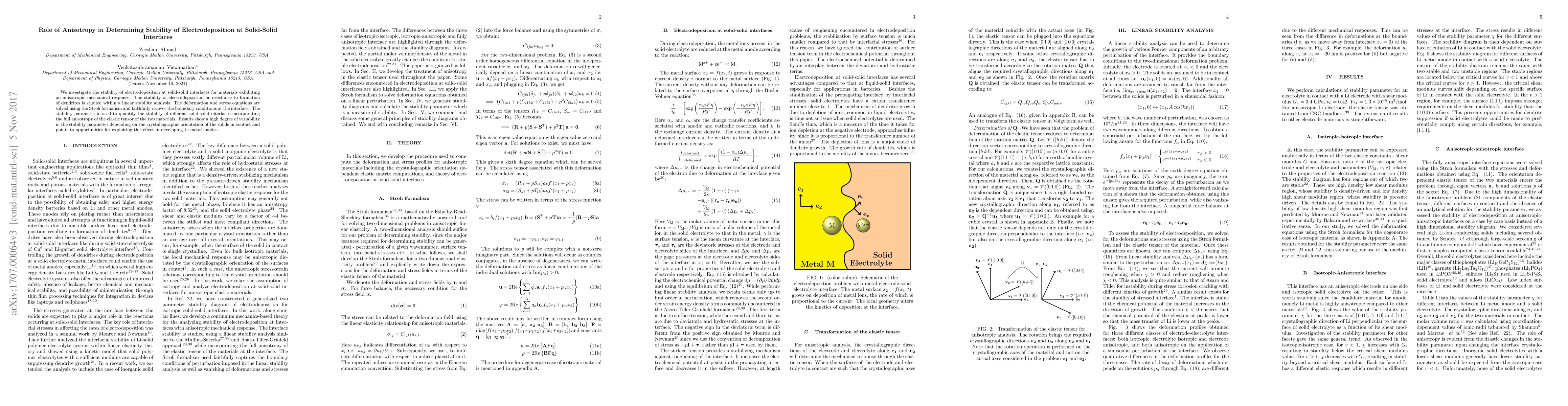 This study examines the stability of electrodeposition at solid-solid interfaces for anisotropic materials, using linear stability analysis and the Stroh formalism to solve deformation and stress equations. Results reveal significant variability in stability parameters based on the crystallographic orientation, suggesting potential for enhancing Li metal anodes.