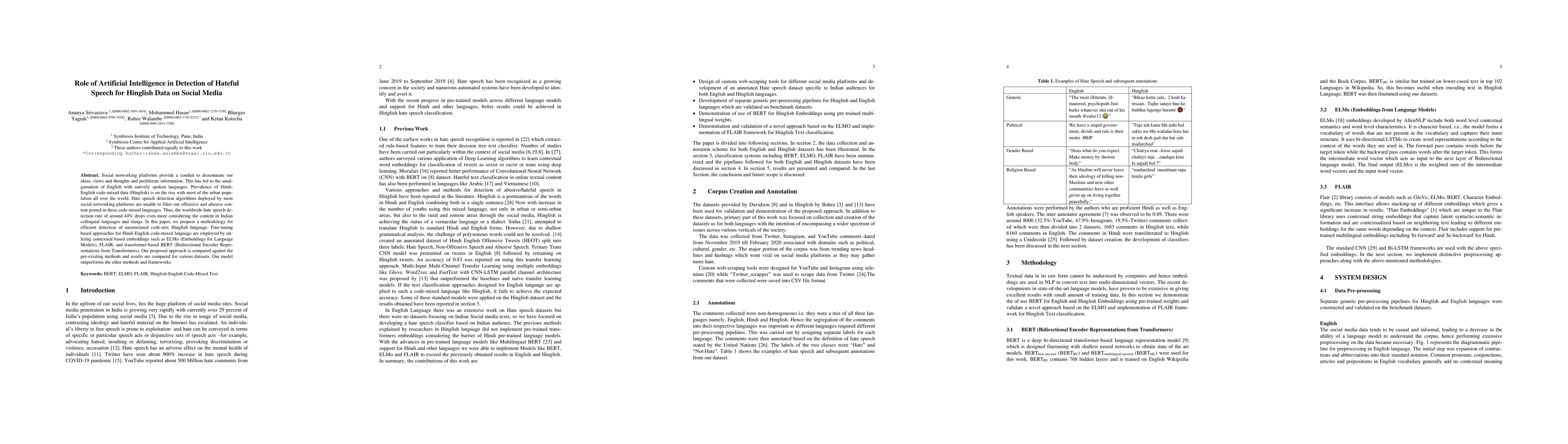 Social networking platforms provide a conduit to disseminate our ideas, views and thoughts and proliferate information. This has led to the amalgamation of English with natively spoken languages. Prevalence of Hindi-English code-mixed data (Hinglish) is on the rise with most of the urban population all over the world. Hate speech detection algorithms deployed by most social networking platforms are unable to filter out offensive and abusive content posted in these code-mixed languages. Thus, the worldwide hate speech detection rate of around 44% drops even more considering the content in Indian colloquial languages and slangs. In this paper, we propose a methodology for efficient detection of unstructured code-mix Hinglish language. Fine-tuning based approaches for Hindi-English code-mixed language are employed by utilizing contextual based embeddings such as ELMo (Embeddings for Language Models), FLAIR, and transformer-based BERT (Bidirectional Encoder Representations from Transformers). Our proposed approach is compared against the pre-existing methods and results are compared for various datasets. Our model outperforms the other methods and frameworks.