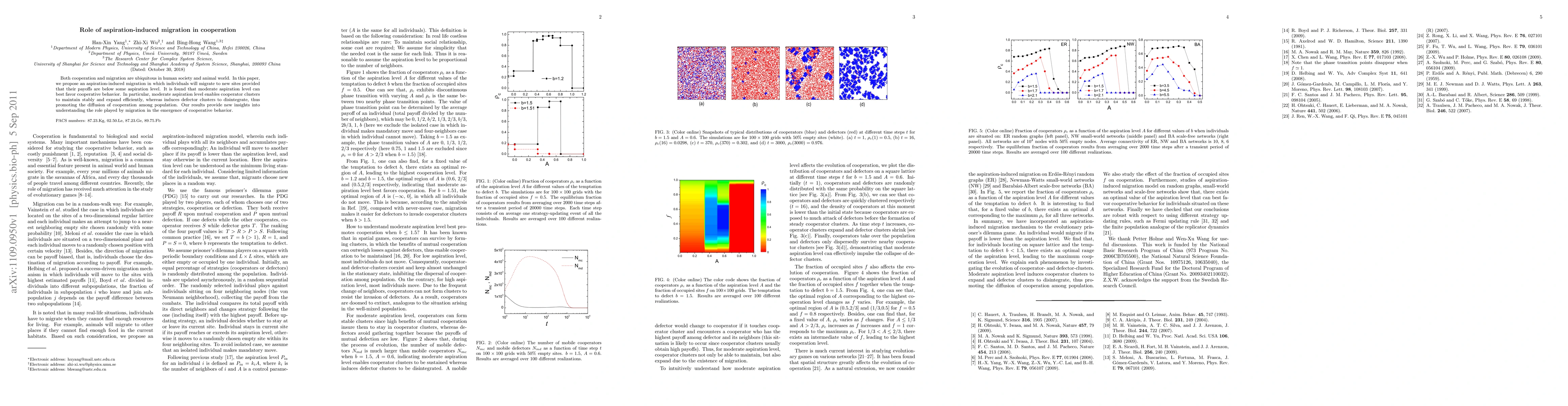 This paper explores how aspiration-induced migration, where individuals move if their payoffs fall below a certain aspiration level, influences cooperation. It finds that moderate aspiration levels promote cooperation by sustaining cooperator clusters and dismantling defector clusters, thus enhancing cooperative behavior in populations.