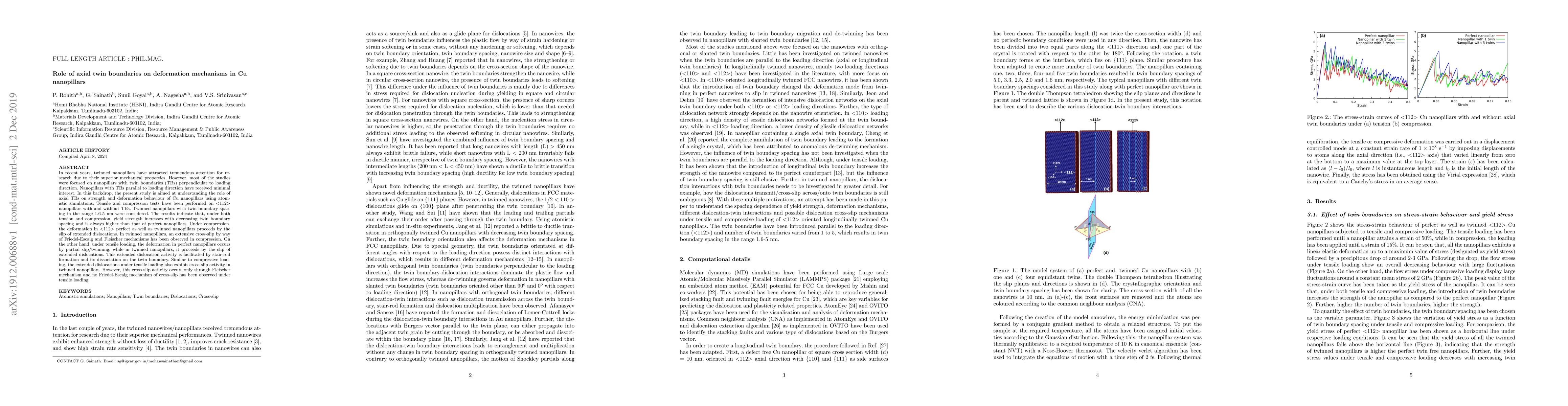In recent years, twinned nanopillars have attracted tremendous attention for research due to their superior mechanical properties. However, most of the studies were focused on nanopillars with twin boundaries (TBs) perpendicular to loading direction. Nanopillars with TBs parallel to loading direction have received minimal interest. In this backdrop, the present study is aimed at understanding the role of axial TBs on strength and deformation behaviour of Cu nanopillars using atomistic simulations. Tensile and compression tests have been performed on $<$112$>$ nanopillars with and without TBs. Twinned nanopillars with twin boundary spacing in the range 1.6-5 nm were considered. The results indicate that, under both tension and compression, yield strength increases with decreasing twin boundary spacing and is always higher than that of perfect nanopillars. Under compression, the deformation in $<$112$>$ perfect as well as twinned nanopillars proceeds by the slip of extended dislocations. In twinned nanopillars, an extensive cross-slip by way of Friedel-Escaig and Fleischer mechanisms has been observed in compression. On the other hand, under tensile loading, the deformation in perfect nanopillars occurs by partial slip/twinning, while in twinned nanopillars, it proceeds by the slip of extended dislocations. This extended dislocation activity is facilitated by stair-rod formation and its dissociation on the twin boundary. Similar to compressive loading, the extended dislocations under tensile loading also exhibit cross-slip activity in twinned nanopillars. However, this cross-slip activity occurs only through Fleischer mechanism and no Friedel-Escaig mechanism of cross-slip has been observed under tensile loading.