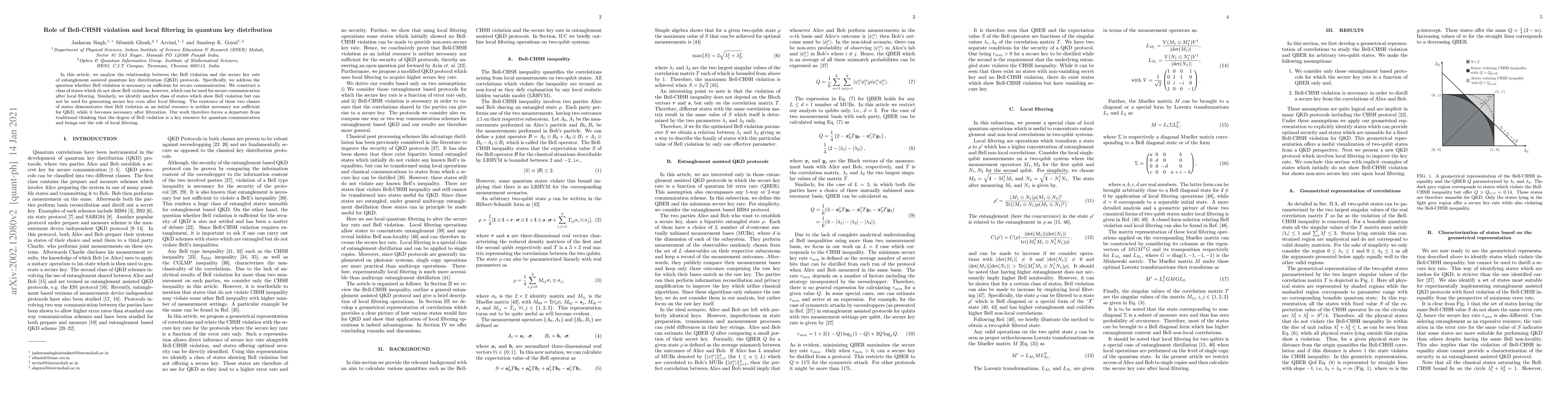 Researchers found that Bell violation is neither necessary nor sufficient for secure quantum key distribution, highlighting the importance of local filtering in QKD protocols.