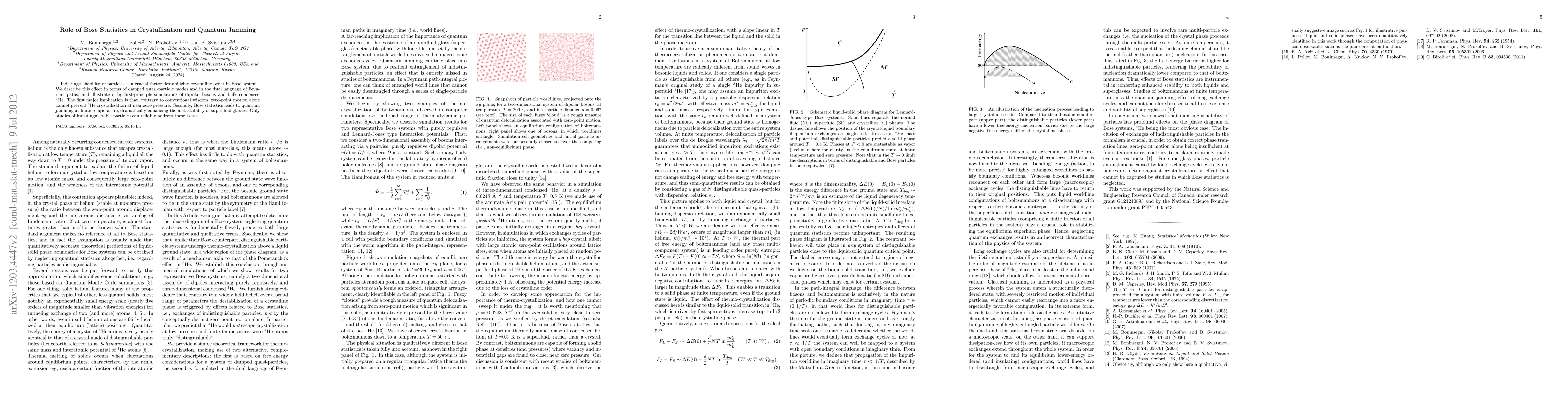 Indistinguishability of particles is a major factor destabilizing crystalline order in Bose systems. We describe this effect in terms of damped quasi-particle modes and in the dual language of Feynman paths, and illustrate it by first-principle simulations of dipolar bosons and bulk condensed helium-four. The first major implication is that, contrary to conventional wisdom, zero-point motion alone cannot prevent helium-four crystallization at low temperature, at saturated vapour pressure. Secondly, Bose statistics leads to quantum jamming at finite temperature, dramatically enhancing the metastability of superfluid glasses. Only studies of indistinguishable particles can reliably address these issues.
