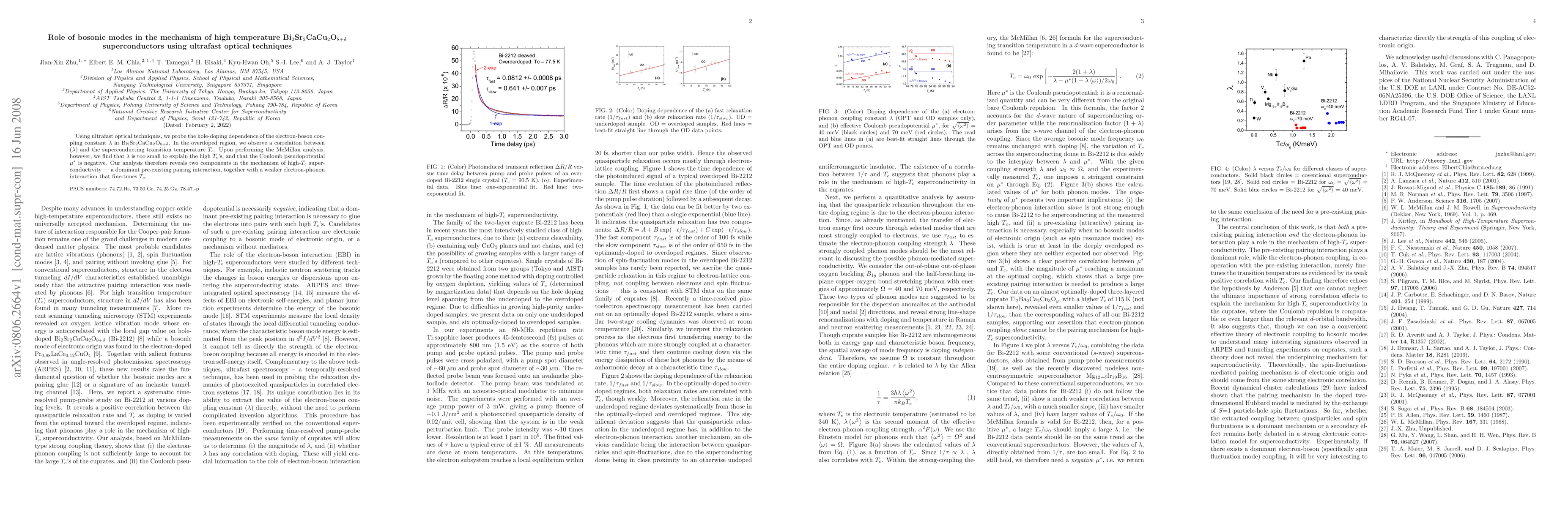 Using ultrafast optical techniques, we probe the hole-doping dependence of the electron-boson coupling constant $\lambda$ in Bi$_{2}$Sr$_{2}$CaCu$_{2}$O$_{8+\delta}$. In the overdoped region, we observe a correlation between ($\lambda$) and the superconducting transition temperature $T_{c}$. Upon performing the McMillan analysis, however, we find that $\lambda$ is too small to explain the high $T_{c}$'s, and that the Coulomb pseudopotential $\mu^{\ast}$ is negative. Our analysis therefore reveals two components in the mechanism of high-$T_{c}$ superconductivity -- a dominant pre-existing pairing interaction, together with a weaker electron-phonon interaction that fine-tunes $T_{c}$.