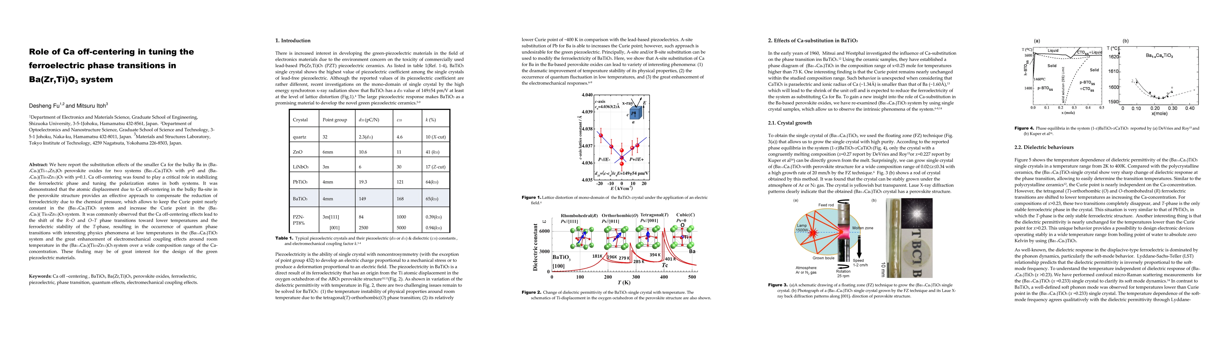 This study investigates the role of calcium off-centering in tuning the ferroelectric phase transitions in Ba(Zr,Ti)O3 perovskite oxides. The research demonstrates that Ca off-centering stabilizes ferroelectric phases and enhances polarization states, leading to significant changes in Curie points and electromechanical coupling effects, which are crucial for developing green piezoelectric materials.