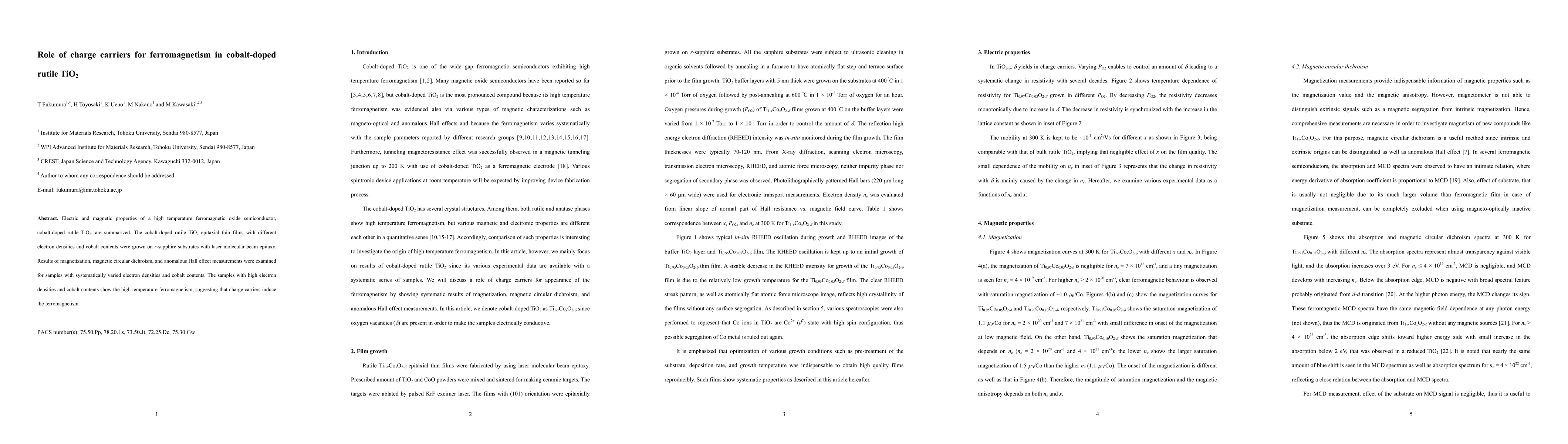 Cobalt-doped rutile TiO2 epitaxial thin films exhibit high temperature ferromagnetism, with electron density and cobalt content influencing magnetic properties, indicating that charge carriers play a crucial role in inducing ferromagnetism.