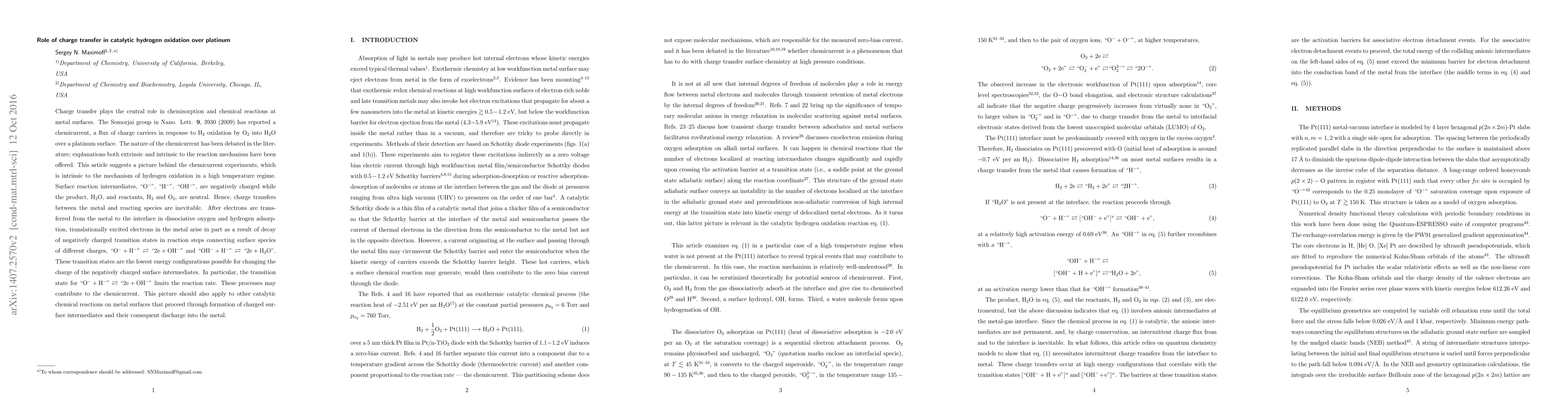This paper elucidates the intrinsic role of charge transfer in catalytic hydrogen oxidation over platinum, explaining the chemicurrent observed during $\mathrm{H_2}$ oxidation by $\mathrm{O_2}$ to $\mathrm{H_2O}$. It posits that charge transfers between the metal and negatively charged surface intermediates, such as $\mathrm{O^-}$, $\mathrm{H^-}$, and $\mathrm{OH^-}$, are essential for the reaction mechanism.