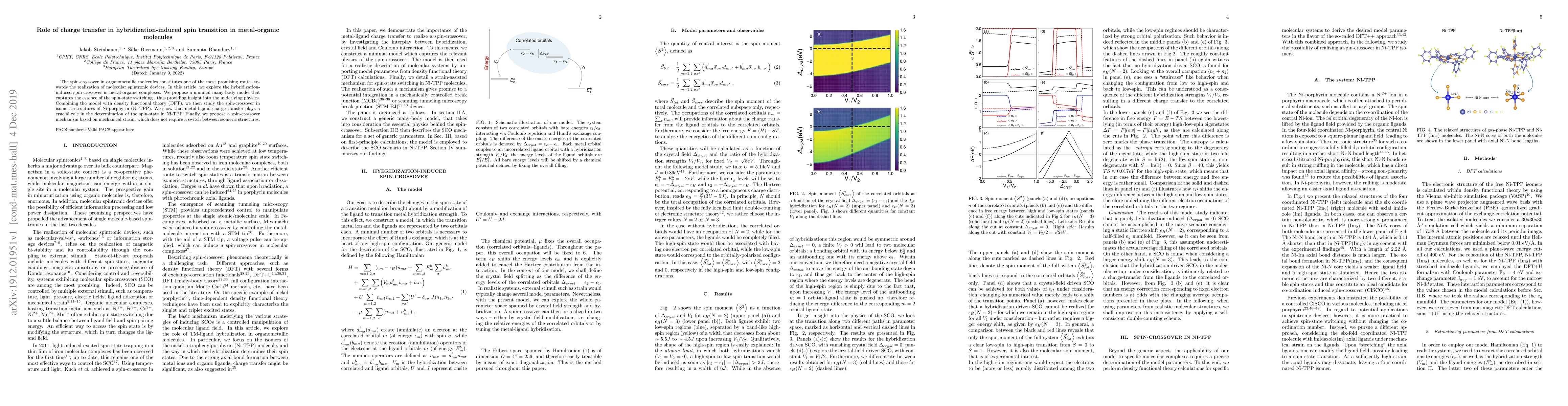 The spin-crossover in organometallic molecules constitutes one of the most promising routes towards the realization of molecular spintronic devices. In this article, we explore the hybridization-induced spin-crossover in metal-organic complexes. We propose a minimal many-body model that captures the essence of the spin-state switching in a generic parameter space, thus providing insight into the underlying physics. Combining the model with density functional theory (DFT), we then study the spin-crossover in isomeric structures of Ni-porphyrin (Ni-TPP). We show that metal-ligand charge transfer plays a crucial role in the determination of the spin-state in Ni-TPP. Finally, we propose a spin-crossover mechanism based on mechanical strain, which does not require a switch between isomeric structures.