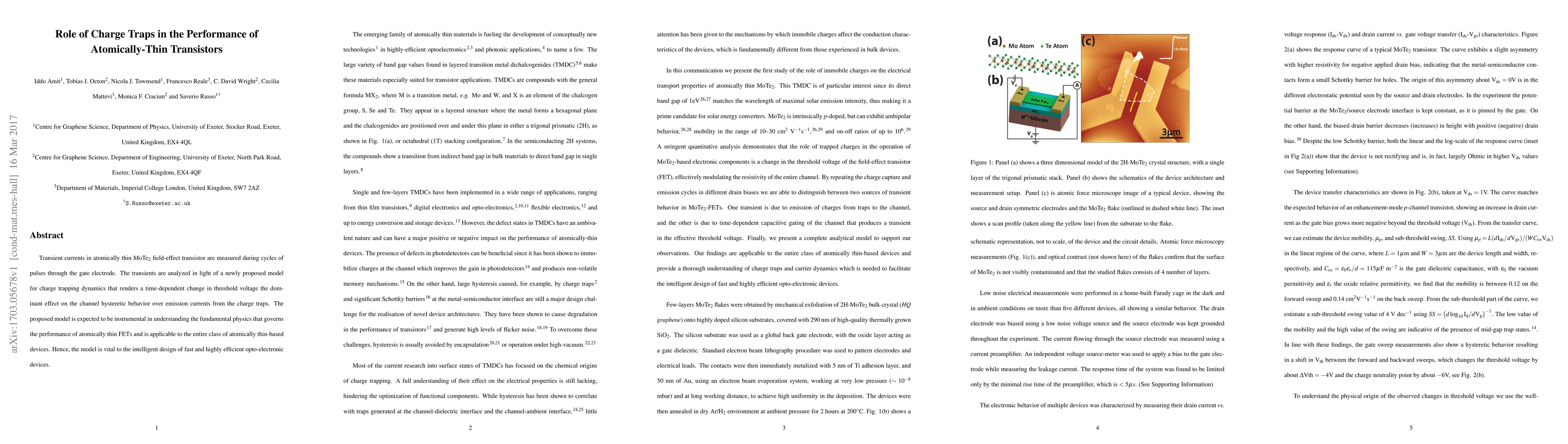 Transient currents in atomically thin MoTe$_2$ field-effect transistor are measured during cycles of pulses through the gate electrode. The transients are analyzed in light of a newly proposed model for charge trapping dynamics that renders a time-dependent change in threshold voltage the dominant effect on the channel hysteretic behavior over emission currents from the charge traps. The proposed model is expected to be instrumental in understanding the fundamental physics that governs the performance of atomically thin FETs and is applicable to the entire class of atomically thin-based devices. Hence, the model is vital to the intelligent design of fast and highly efficient opto-electronic devices.