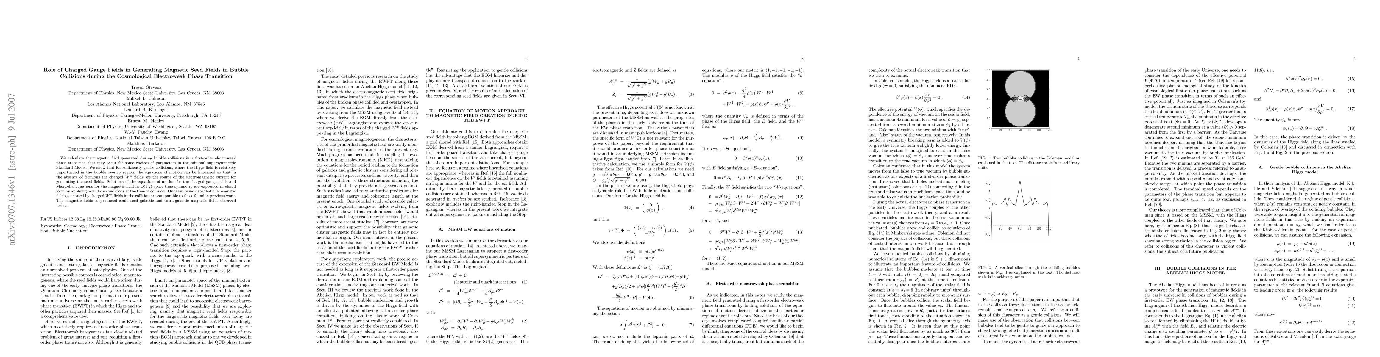 We calculate the magnetic field generated during bubble collisions in a first-order electroweak phase transition that may occur for some choices of parameters in the minimal supersymmetric Standard Model. We show that for sufficiently gentle collisions, where the Higgs field is relatively unperturbed in the bubble overlap region, the equations of motion can be linearized so that in the absence of fermions the charged W fields are the source of the electromagnetic current for generating the seed fields. Solutions of the equations of motion for the charged gauge fields and Maxwell's equations for the magnetic field in O(1,2) space-time symmetry are expressed in closed form by applying boundary conditions at the time of collision. Our results indicate that the magnetic fields generated by charged $W^{\pm}$ fields in the collision are comparable to those found in previous work. The magnetic fields so produced could seed galactic and extra-galactic magnetic fields observed today.