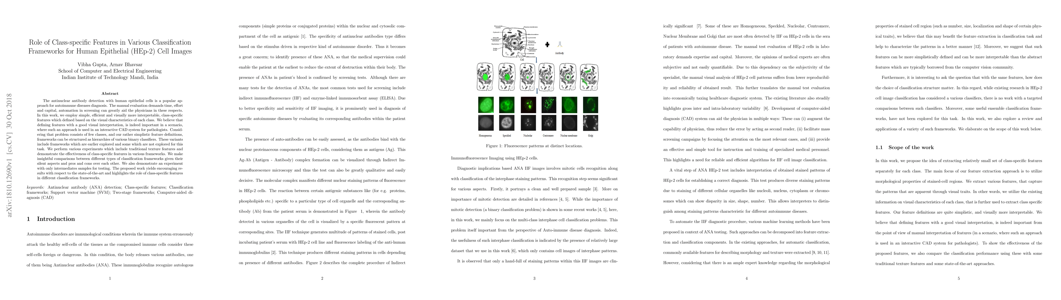 The antinuclear antibody detection with human epithelial cells is a popular approach for autoimmune diseases diagnosis. The manual evaluation demands time, effort and capital, and automation in screening can greatly aid the physicians in these respects. In this work, we employ simple, efficient and visually more interpretable, class-specific features which defined based on the visual characteristics of each class. We believe that defining features with a good visual interpretation, is indeed important in a scenario, where such an approach is used in an interactive CAD system for pathologists. Considering that problem consists of few classes, and our rather simplistic feature definitions, frameworks can be structured as hierarchies of various binary classifiers. These variants include frameworks which are earlier explored and some which are not explored for this task. We perform various experiments which include traditional texture features and demonstrate the effectiveness of class-specific features in various frameworks. We make insightful comparisons between different types of classification frameworks given their silent aspects and pros and cons over each other. We also demonstrate an experiment with only intermediates samples for testing. The proposed work yields encouraging results with respect to the state-of-the-art and highlights the role of class-specific features in different classification frameworks.