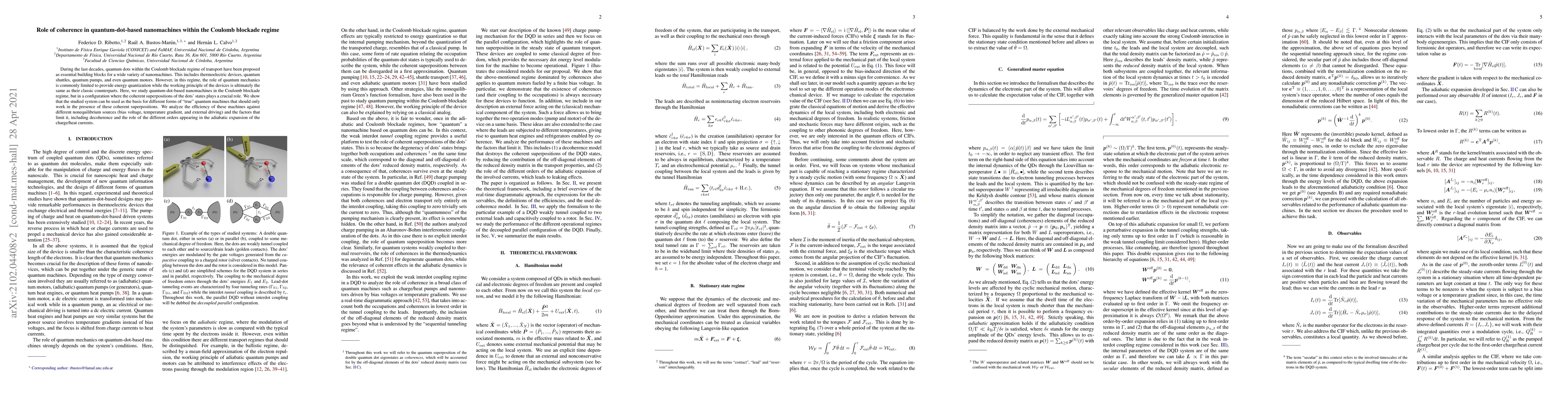 During the last decades, quantum dots within the Coulomb blockade regime of transport have been proposed as essential building blocks for a wide variety of nanomachines. This includes thermoelectric devices, quantum shuttles, quantum pumps, and even quantum motors. However, in this regime, the role of quantum mechanics is commonly limited to provide energy quantization while the working principle of the devices is ultimately the same as their classic counterparts. Here, we study quantum-dot-based nanomachines in the Coulomb blockade regime, but in a configuration where the coherent superpositions of the dots' states plays a crucial role. We show that the studied system can be used as the basis for different forms of "true" quantum machines that should only work in the presence of these coherent superpositions. We analyze the efficiency of these machines against different nonequilibrium sources (bias voltage, temperature gradient, and external driving) and the factors that limit it, including decoherence and the role of the different orders appearing in the adiabatic expansion of the charge/heat currents.