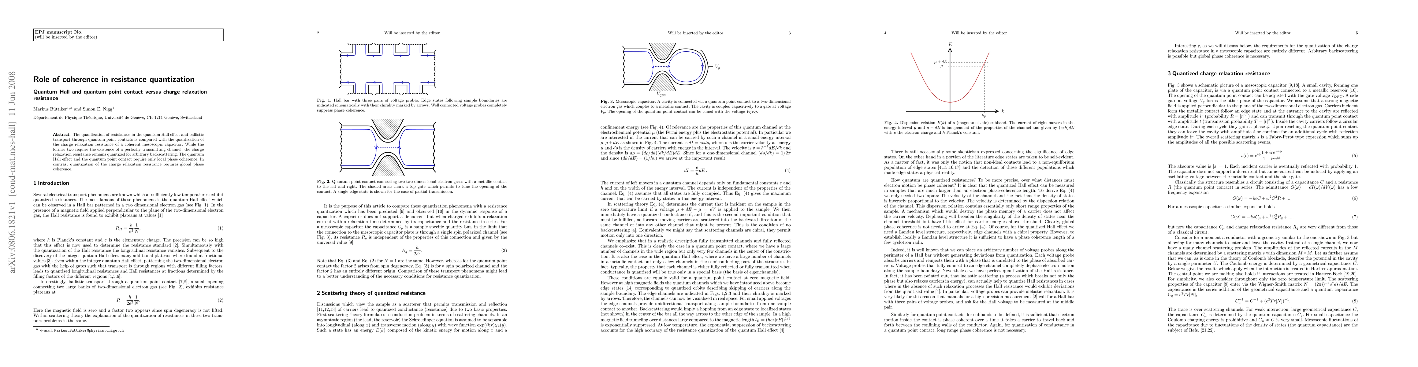 This paper explores the role of coherence in resistance quantization, comparing the quantum Hall effect and ballistic transport through quantum point contacts with the charge relaxation resistance in mesoscopic capacitors, highlighting that while the former require local phase coherence, the latter demands global phase coherence.