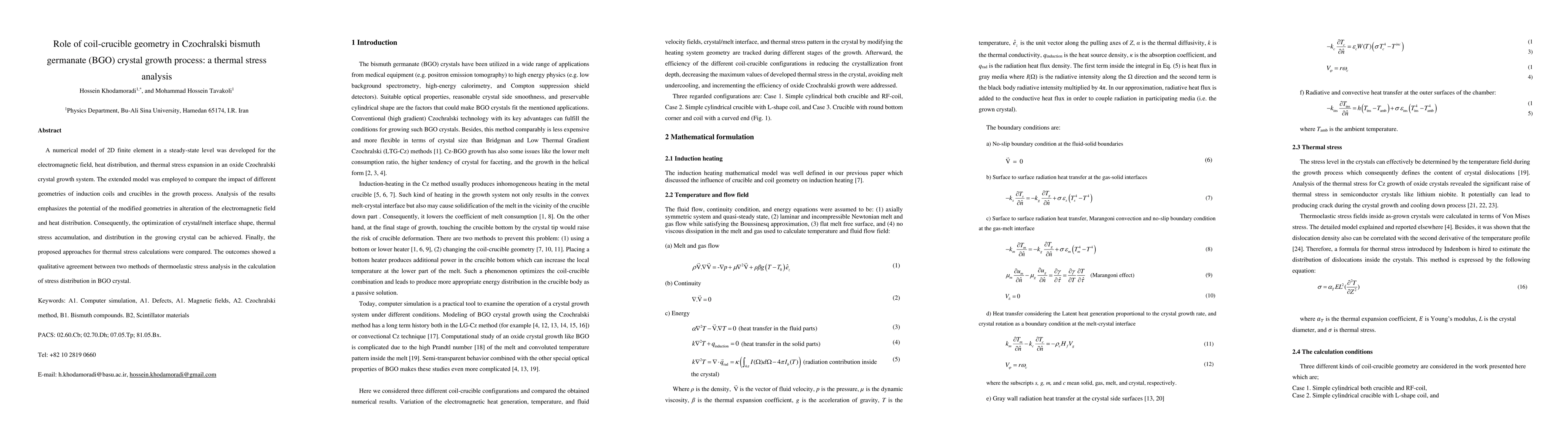 This paper develops a numerical model to analyze the impact of coil and crucible geometry on the thermal stress during the growth of bismuth germanate (BGO) crystals using the Czochralski method. The study finds that optimized geometries can improve electromagnetic field and heat distribution, leading to better control of thermal stress and crystal/melt interface shape.