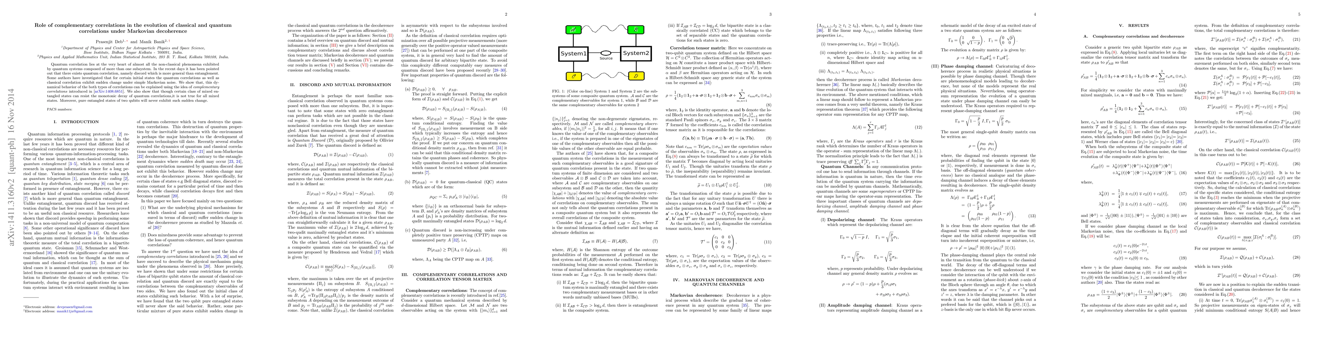 This paper explores how complementary correlations explain the evolution of classical and quantum correlations under Markovian decoherence. It demonstrates that while some mixed entangled states can resist the decay of quantum correlations, pure entangled states do not exhibit sudden changes in correlation dynamics.