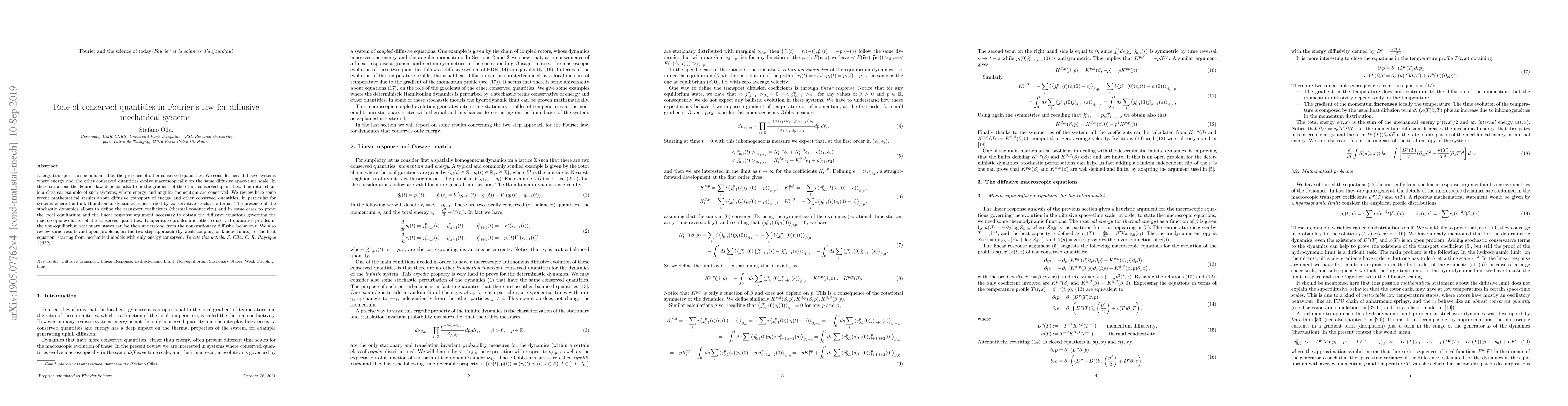 This paper explores how conserved quantities beyond energy affect Fourier's law in diffusive mechanical systems, particularly in systems like rotor chains where both energy and angular momentum are conserved. It examines the influence of stochastic dynamics on transport coefficients and the derivation of diffusive equations governing macroscopic evolution.