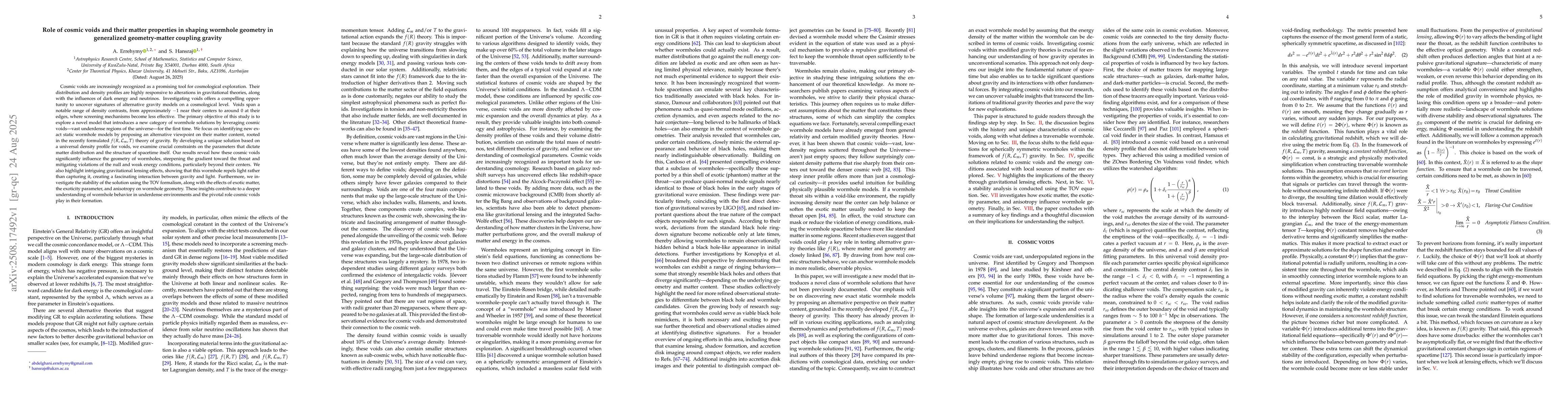 Cosmic voids are increasingly recognized as a promising tool for cosmological exploration. Their distribution and density profiles are highly responsive to alterations in gravitational theories, along with the influences of dark energy and neutrinos. Investigating voids offers a compelling opportunity to uncover signatures of alternative gravity models on a cosmological level. Voids span a notable range of density contrasts, from approximately -$1$ near their centers to around $0$ at their edges, where screening mechanisms become less effective. The primary objective of this study is to explore a novel model that introduces a new category of wormhole solutions by leveraging cosmic voids$-$vast underdense regions of the universe$-$for the first time. We focus on identifying new exact static wormhole models by proposing an alternative viewpoint on their matter content, rooted in the recently formulated $f(R,\mathcal{L}_m,T)$ theory of gravity. By developing a unique solution based on a universal density profile for voids, we examine crucial constraints on the parameters that dictate matter distribution and the structure of spacetime itself. Our results reveal how these cosmic voids significantly influence the geometry of wormholes, steepening the gradient toward the throat and mitigating violations of the null and weak energy conditions, particularly beyond their centers. We also highlight intriguing gravitational lensing effects, showing that this wormhole repels light rather than capturing it, creating a fascinating interaction between gravity and light.