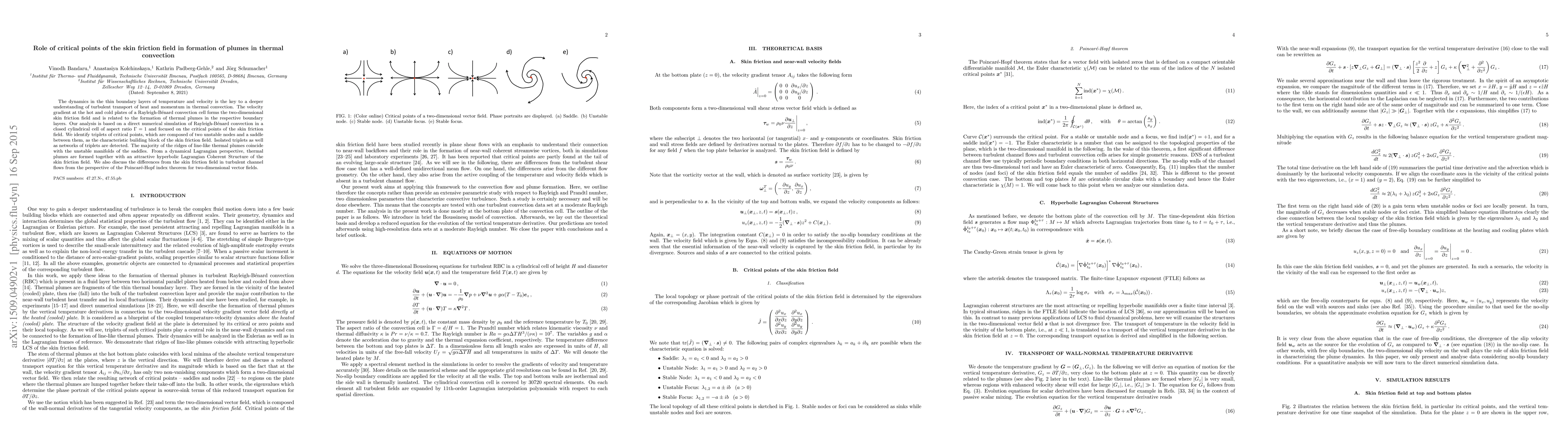 This study investigates the role of critical points in the skin friction field in the formation of thermal plumes in Rayleigh-Bénard convection through direct numerical simulations. It identifies triplets of critical points as the fundamental structure in the skin friction field, linking them to the formation of thermal plumes.