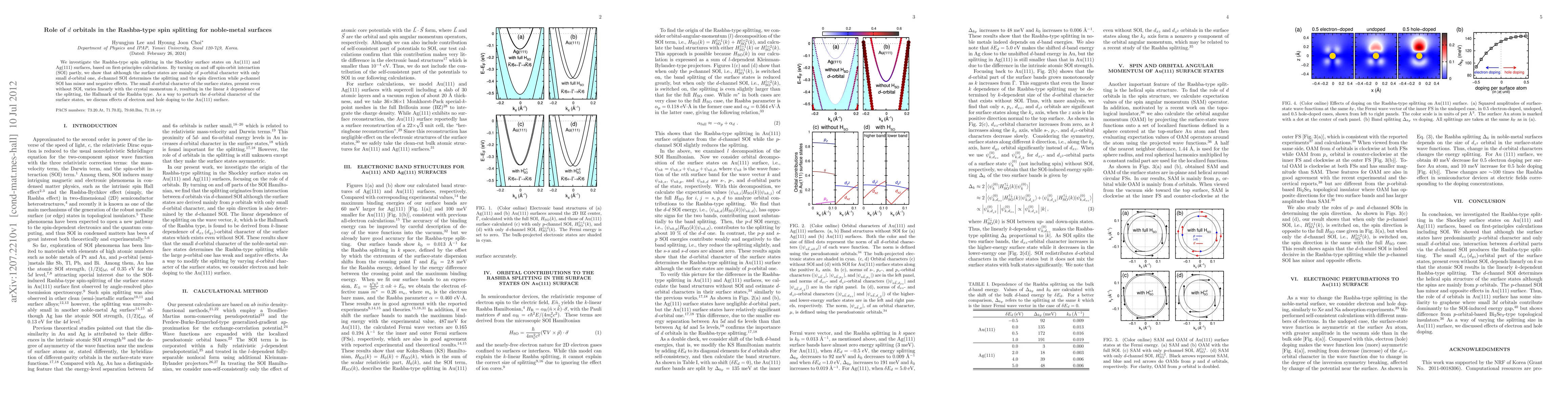 This study reveals that d-orbital spin-orbit interaction (SOI) significantly influences Rashba-type spin splitting in noble-metal surfaces, while p-orbital SOI has minimal impact. The small d-orbital contribution, varying with crystal momentum, underpins the linear k dependence characteristic of Rashba splitting.