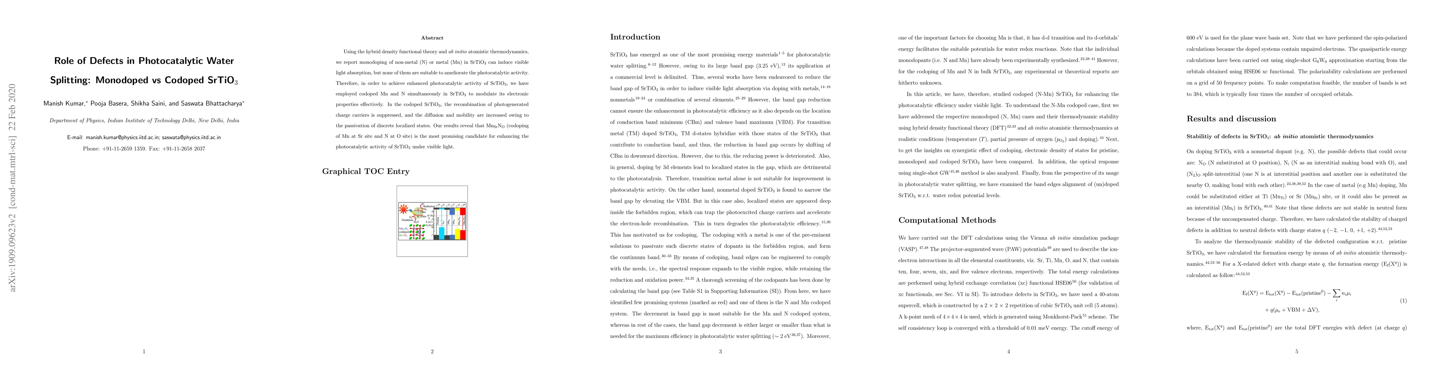 Using the hybrid density functional theory and \textit{ab initio} atomistic thermodynamics, we report monodoping of non-metal (N) or metal (Mn) in SrTiO$_3$ can induce visible light absorption, but none of them are suitable to ameliorate the photocatalytic activity. Therefore, in order to achieve enhanced photocatalytic activity of SrTiO$_3$, we have employed codoped Mn and N simultaneously in SrTiO$_3$ to modulate its electronic properties effectively. In the codoped SrTiO$_3$, the recombination of photogenerated charge carriers is suppressed, and the diffusion and mobility are increased owing to the passivation of discrete localized states. Our results reveal that Mn$_{\textrm{Sr}}\textrm{N}_\textrm{O}$ (codoping of Mn at Sr site and N at O site) is the most promising candidate for enhancing the photocatalytic activity of SrTiO$_3$ under visible light.