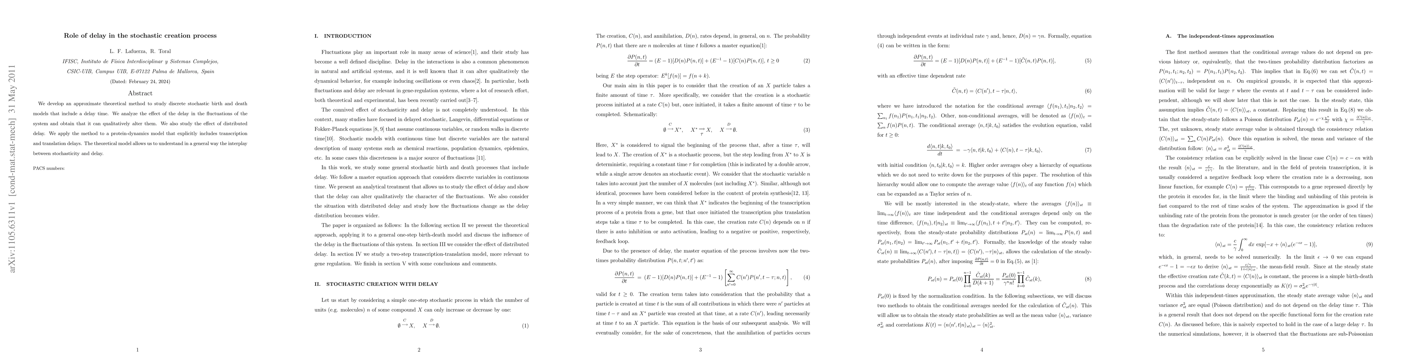 We develop an approximate theoretical method to study discrete stochastic birth and death models that include a delay time. We analyze the effect of the delay in the fluctuations of the system and obtain that it can qualitatively alter them. We also study the effect of distributed delay. We apply the method to a protein-dynamics model that explicitly includes transcription and translation delays. The theoretical model allows us to understand in a general way the interplay between stochasticity and delay.