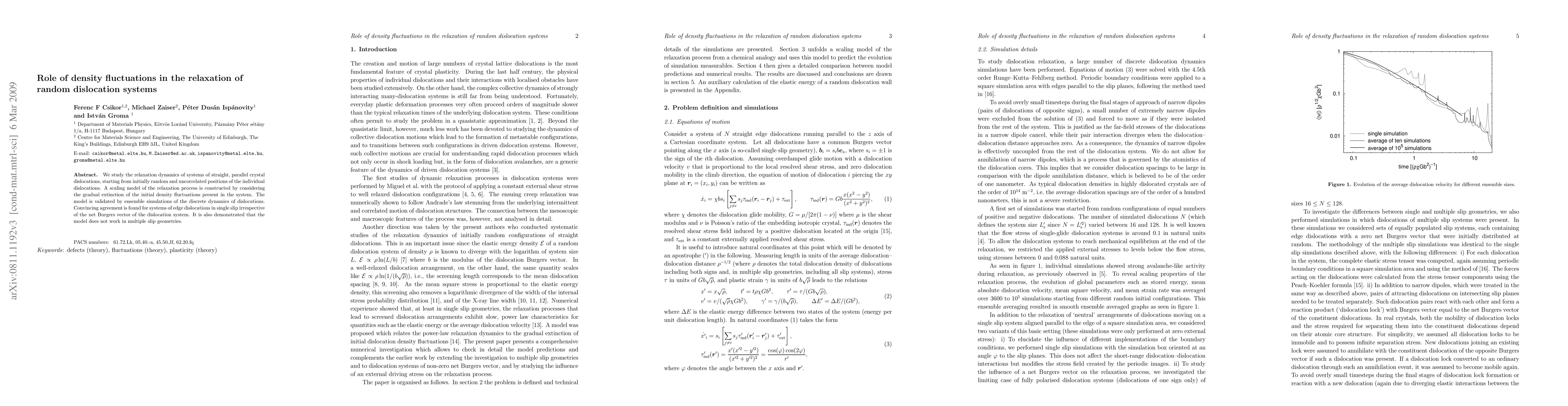 This paper investigates the relaxation dynamics of random dislocation systems, proposing a scaling model based on the extinction of initial density fluctuations. The model is validated through simulations, showing agreement for single slip systems but not for multiple slip geometries.