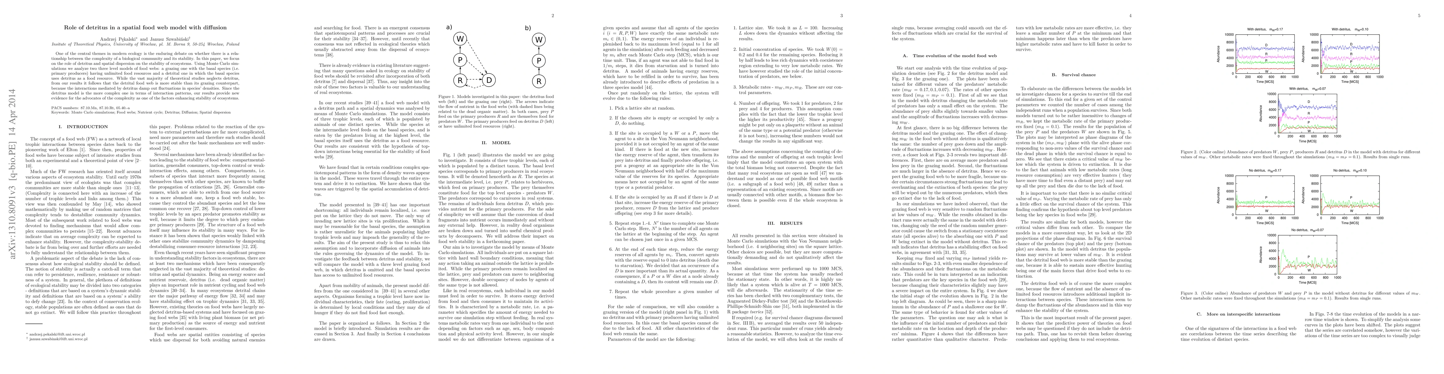 This paper investigates the role of detritus and spatial dispersion in ecosystem stability using Monte Carlo simulations. It finds that detrital food webs, despite being more complex, are more stable than grazing food webs due to detritus-mediated interactions that dampen species density fluctuations.