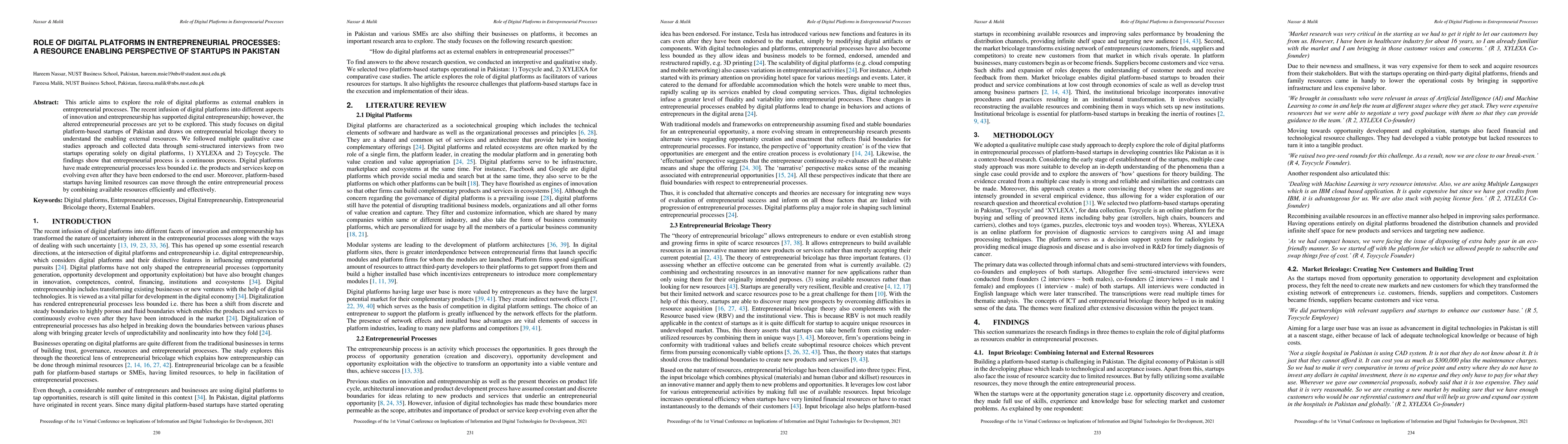 This paper examines how digital platforms act as external enablers in the entrepreneurial processes of Pakistani startups, using XYLEXA and Toycycle as case studies. Findings reveal that digital platforms facilitate continuous evolution of products and services, allowing startups with limited resources to navigate the entrepreneurial journey through efficient resource combination.
