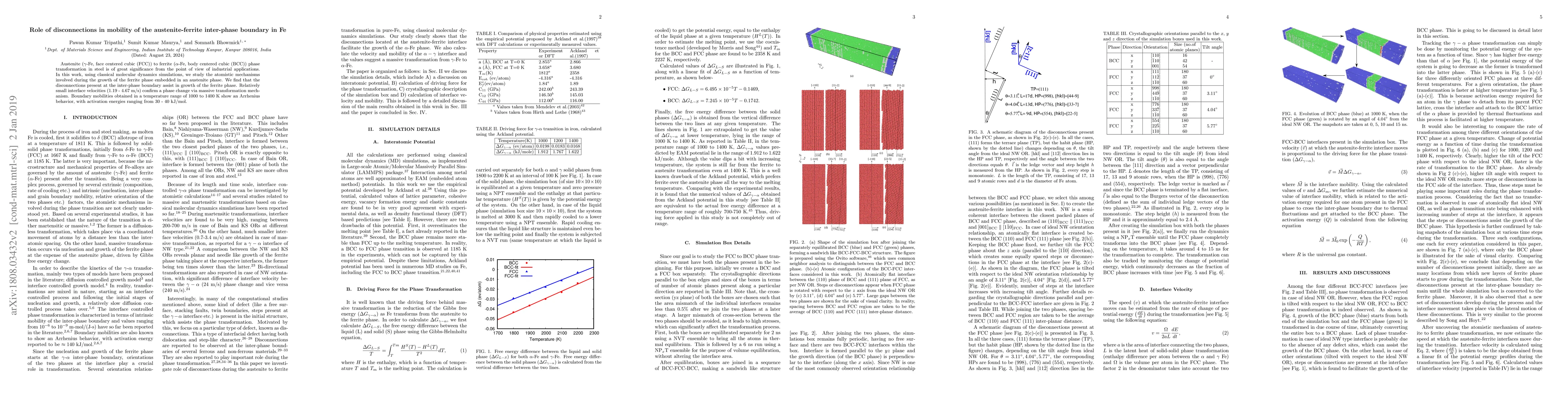 This study uses classical molecular dynamics simulations to investigate the atomistic mechanisms of austenite-ferrite phase transformation in steel, finding that disconnections at the inter-phase boundary act as ferrite nucleation centers. The research reveals an Arrhenius behavior for boundary mobilities with activation energies between 30-40 kJ/mol at temperatures from 1000 to 1400 K.