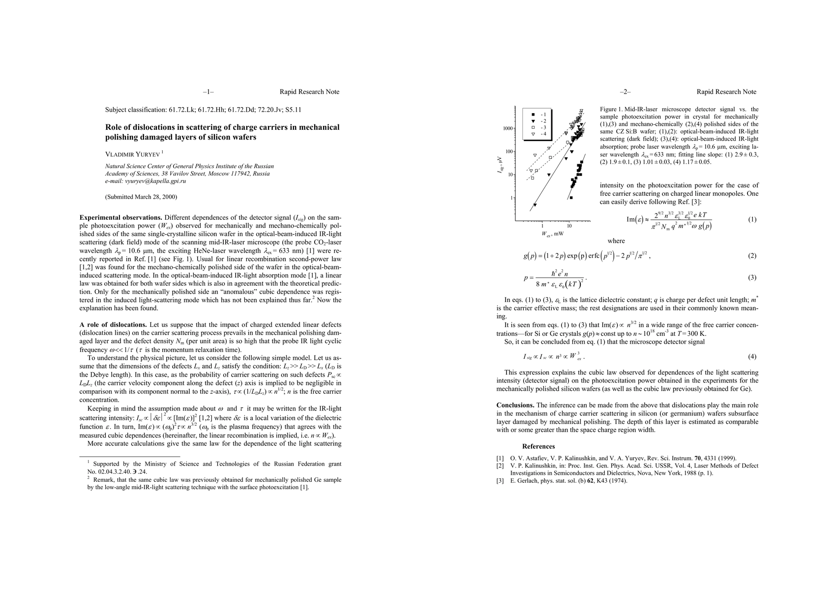 Physical processes resulting in the anomalous (cubic) dependence of the small-angle IR scattering intensity from near-surface layers of mechanically polished silicon and germanium wafers on the photoexcitation power were revealed. It was shown that extended linear defects and dislocations in the damaged region contribute predominantly to carrier scattering.