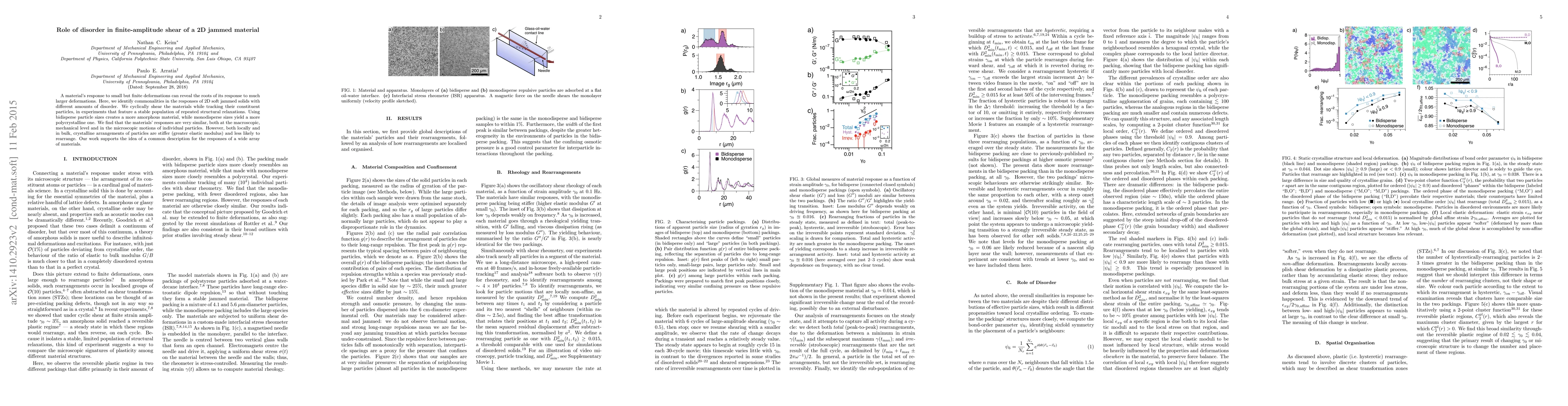 This study explores how 2D jammed materials with varying disorder respond to finite-amplitude shear, revealing that despite differences in particle size distribution, their macroscopic mechanical responses and microscopic particle motions are similar. Crystalline arrangements are stiffer and less likely to rearrange compared to more amorphous structures.