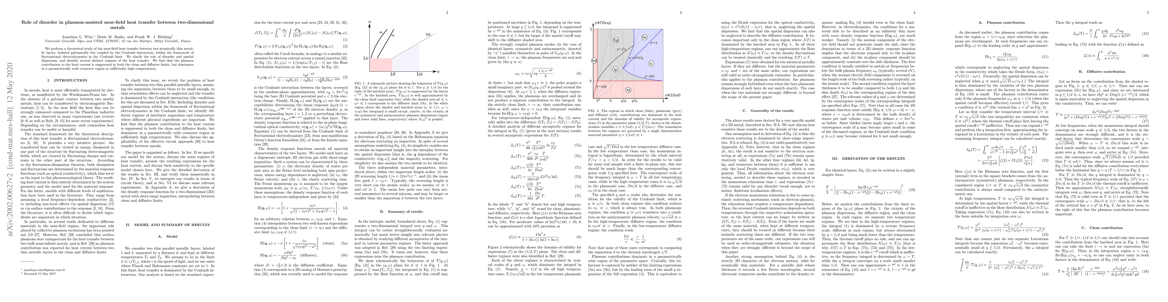 This paper investigates near-field heat transfer between two-dimensional metallic layers using fluctuational electrodynamics, revealing that disorder and spatial dispersion significantly influence heat transfer regimes. The plasmon contribution to heat current dominates in a broad crossover region at high temperatures, contrasting its suppression in clean and diffusive limits.