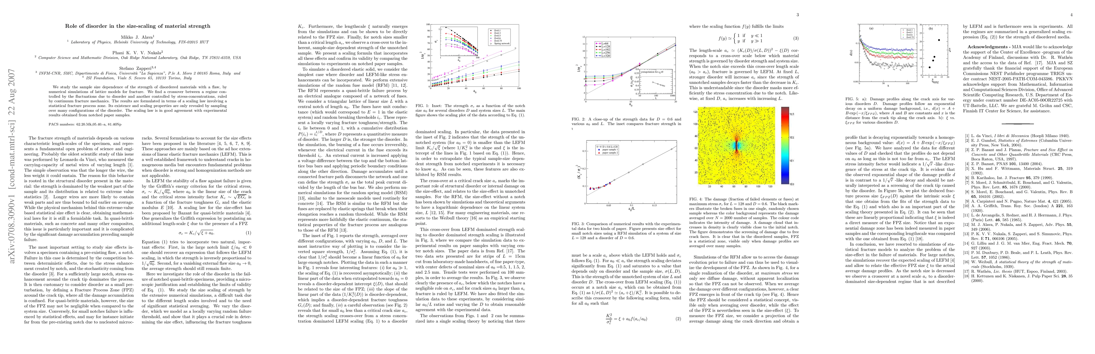 This paper investigates how the size of disordered materials affects their strength through numerical simulations, revealing a crossover between disorder-driven fluctuations and stress-concentration effects. The study formulates a scaling law for the statistical fracture process zone, validated by experimental results on notched paper samples.
