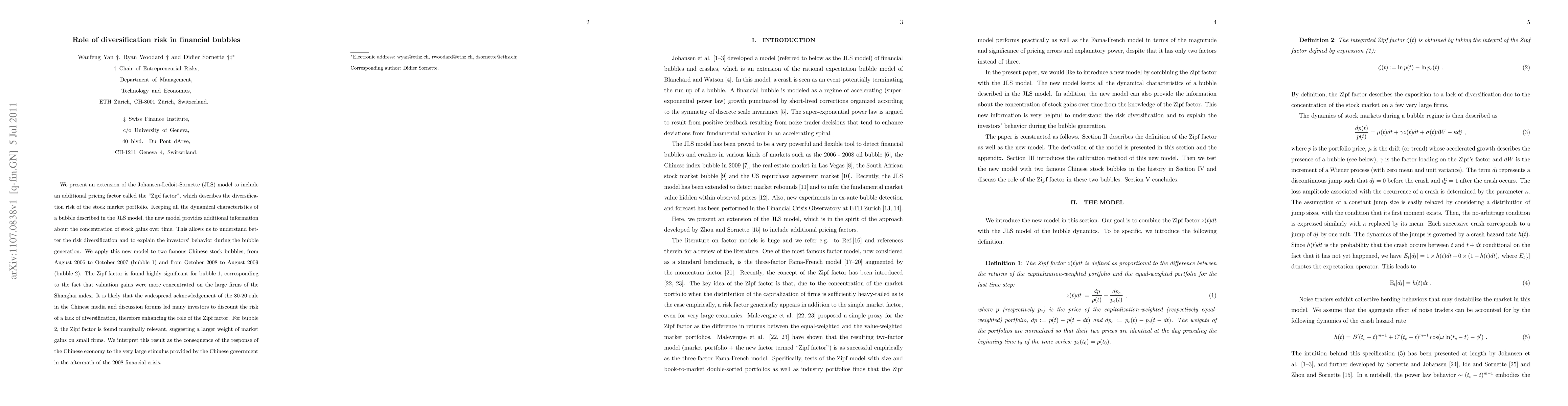 We present an extension of the Johansen-Ledoit-Sornette (JLS) model to include an additional pricing factor called the "Zipf factor", which describes the diversification risk of the stock market portfolio. Keeping all the dynamical characteristics of a bubble described in the JLS model, the new model provides additional information about the concentration of stock gains over time. This allows us to understand better the risk diversification and to explain the investors' behavior during the bubble generation. We apply this new model to two famous Chinese stock bubbles, from August 2006 to October 2007 (bubble 1) and from October 2008 to August 2009 (bubble 2). The Zipf factor is found highly significant for bubble 1, corresponding to the fact that valuation gains were more concentrated on the large firms of the Shanghai index. It is likely that the widespread acknowledgement of the 80-20 rule in the Chinese media and discussion forums led many investors to discount the risk of a lack of diversification, therefore enhancing the role of the Zipf factor. For bubble 2, the Zipf factor is found marginally relevant, suggesting a larger weight of market gains on small firms. We interpret this result as the consequence of the response of the Chinese economy to the very large stimulus provided by the Chinese government in the aftermath of the 2008 financial crisis.