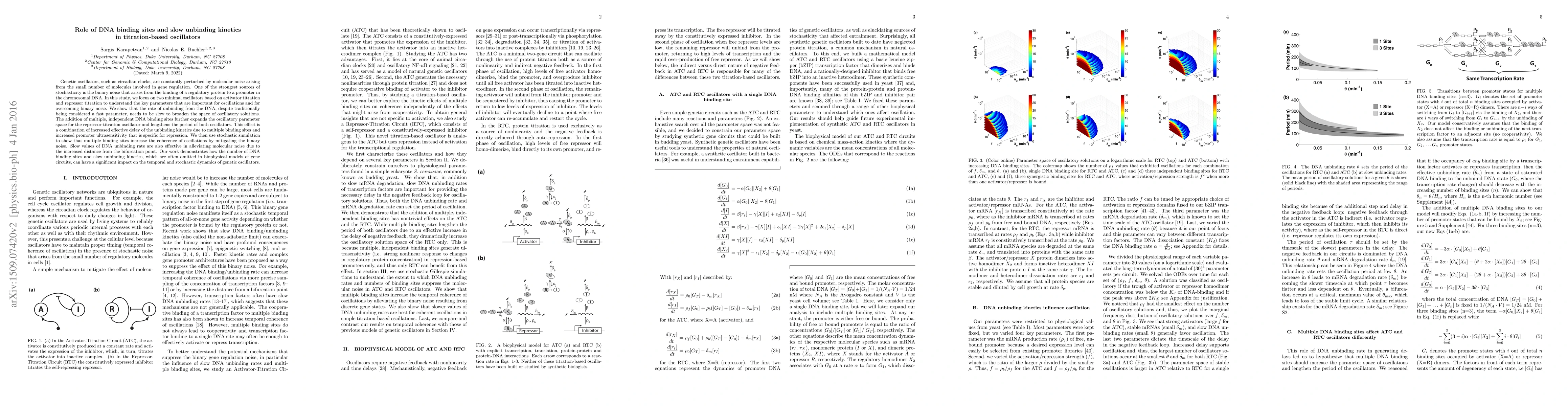 Genetic oscillators, such as circadian clocks, are constantly perturbed by molecular noise arising from the small number of molecules involved in gene regulation. One of the strongest sources of stochasticity is the binary noise that arises from the binding of a regulatory protein to a promoter in the chromosomal DNA. In this study, we focus on two minimal oscillators based on activator titration and repressor titration to understand the key parameters that are important for oscillations and for overcoming binary noise. We show that the rate of unbinding from the DNA, despite traditionally being considered a fast parameter, needs to be slow to broaden the space of oscillatory solutions. The addition of multiple, independent DNA binding sites further expands the oscillatory parameter space for the repressor-titration oscillator and lengthens the period of both oscillators. This effect is a combination of increased effective delay of the unbinding kinetics due to multiple binding sites and increased promoter ultrasensitivity that is specific for repression. We then use stochastic simulation to show that multiple binding sites increase the coherence of the oscillations by mitigating the binary noise. Slow values of DNA unbinding rate are also effective in alleviating molecular noise due to the increased distance from the bifurcation point. Our work demonstrates how DNA binding sites and slow unbinding kinetics, which are often omitted in biophysical models of gene circuits, can have a significant impact on the temporal and stochastic dynamics of genetic oscillators.