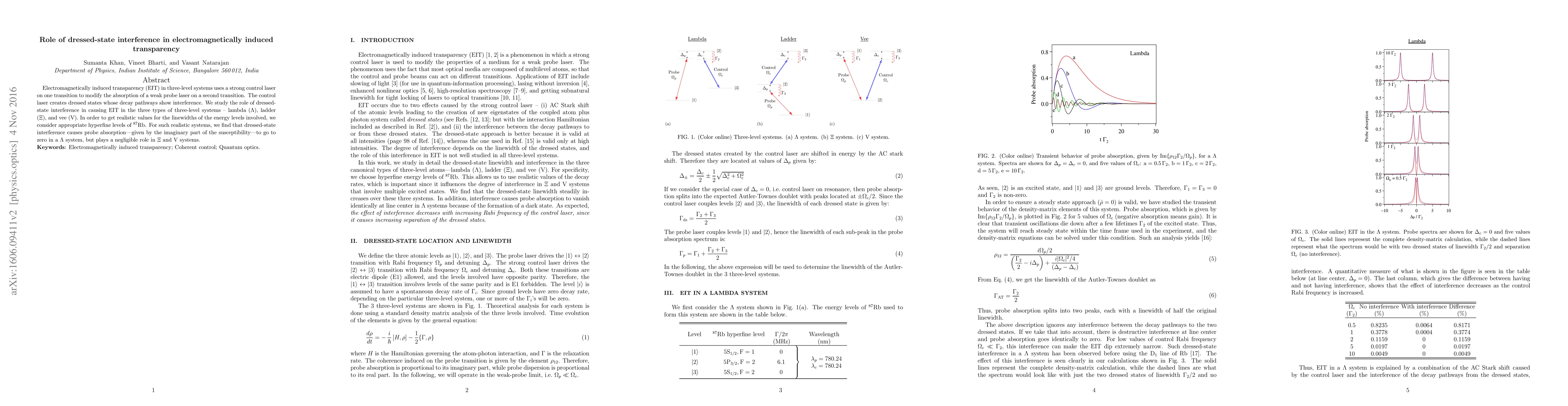 This paper investigates the role of dressed-state interference in electromagnetically induced transparency (EIT) in three-level systems, finding that it causes probe absorption to vanish in $\Lambda$ systems but has minimal impact in ladder and vee configurations. Realistic linewidths for $^{87}$Rb hyperfine levels are considered for analysis.