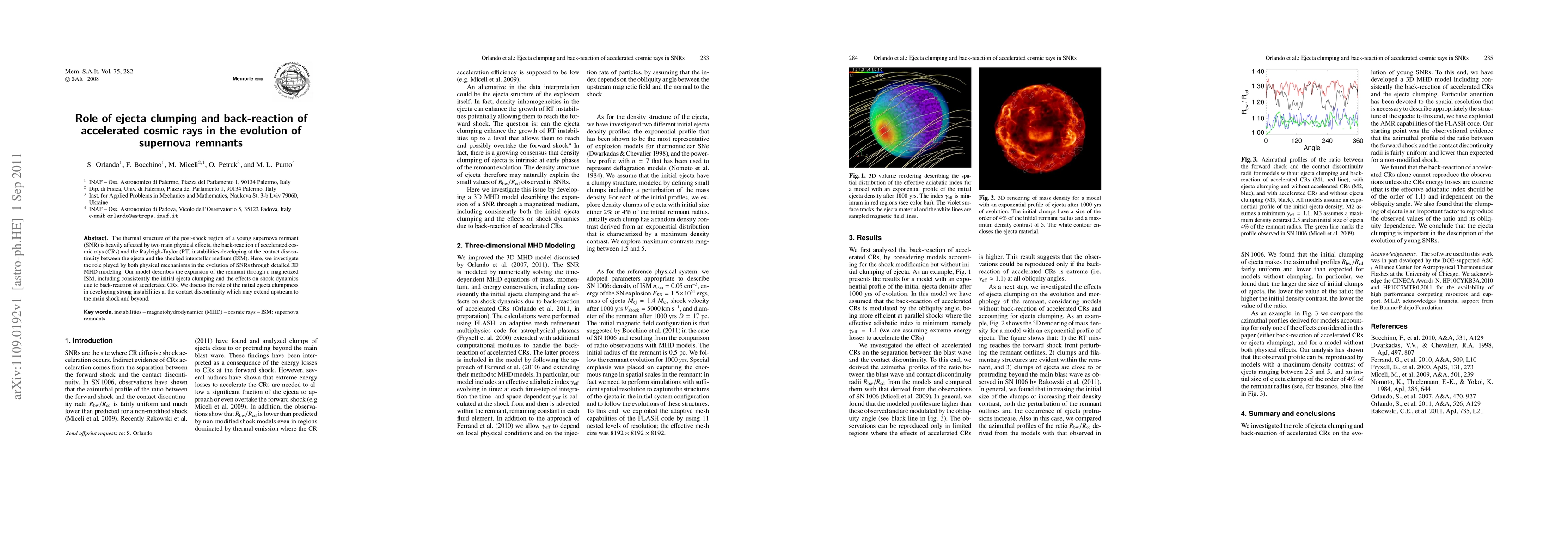 This paper explores the impact of ejecta clumping and the back-reaction of accelerated cosmic rays on the evolution of supernova remnants using detailed 3D MHD modeling, highlighting how these factors influence the thermal structure and shock dynamics in the post-shock region.