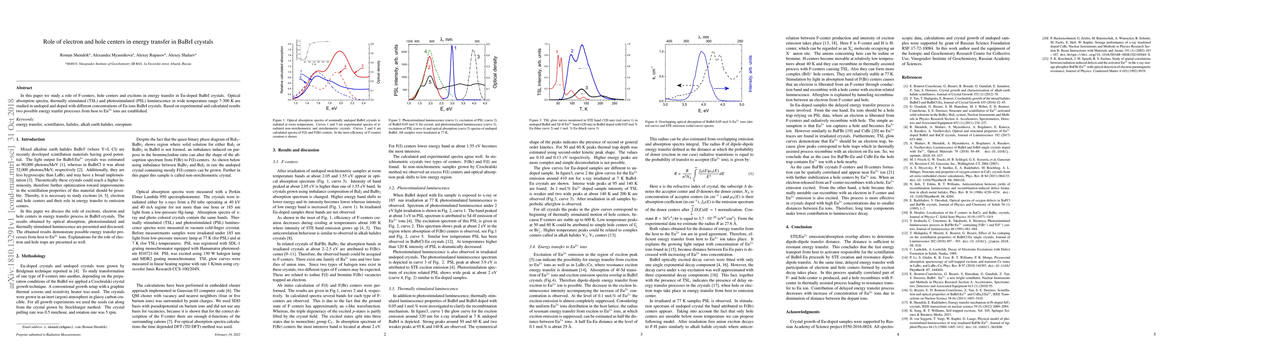 This paper investigates the role of F-centers, hole centers, and excitons in energy transfer in Eu-doped BaBrI crystals using optical absorption and luminescence studies. Two possible energy transfer processes from host to Eu$^{2+}$ ions are identified based on experimental data.