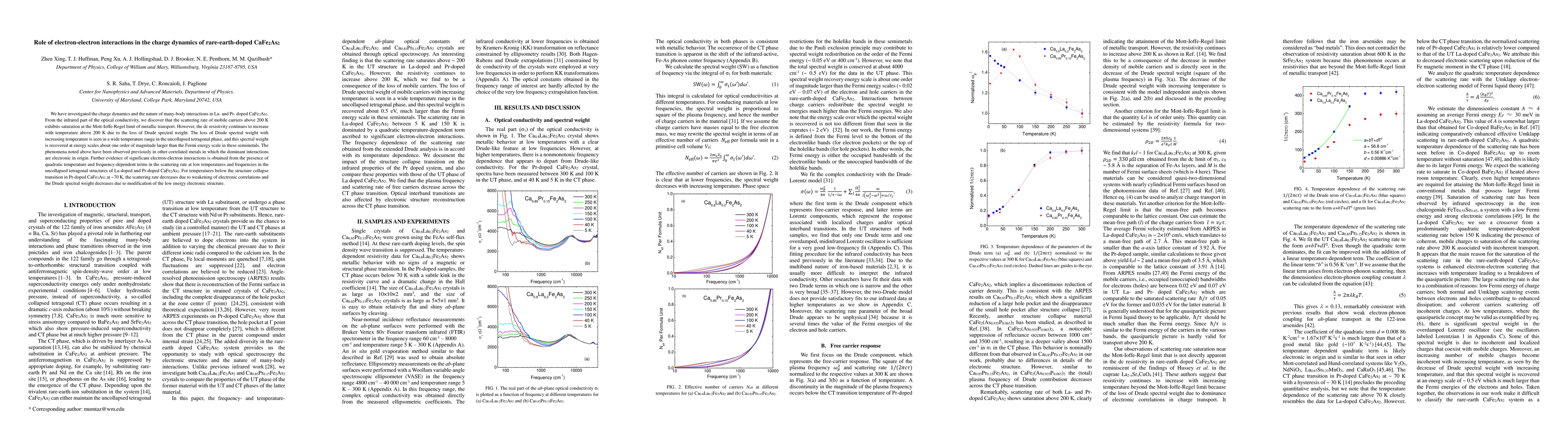 This study investigates the charge dynamics in La- and Pr-doped CaFe2As2, revealing that electron-electron interactions significantly influence carrier scattering above 200 K, leading to a loss of Drude spectral weight and increased dc resistivity despite saturation in the scattering rate. The findings suggest strong many-body interactions, evidenced by temperature-dependent scattering rates and spectral weight recovery at higher energy scales.