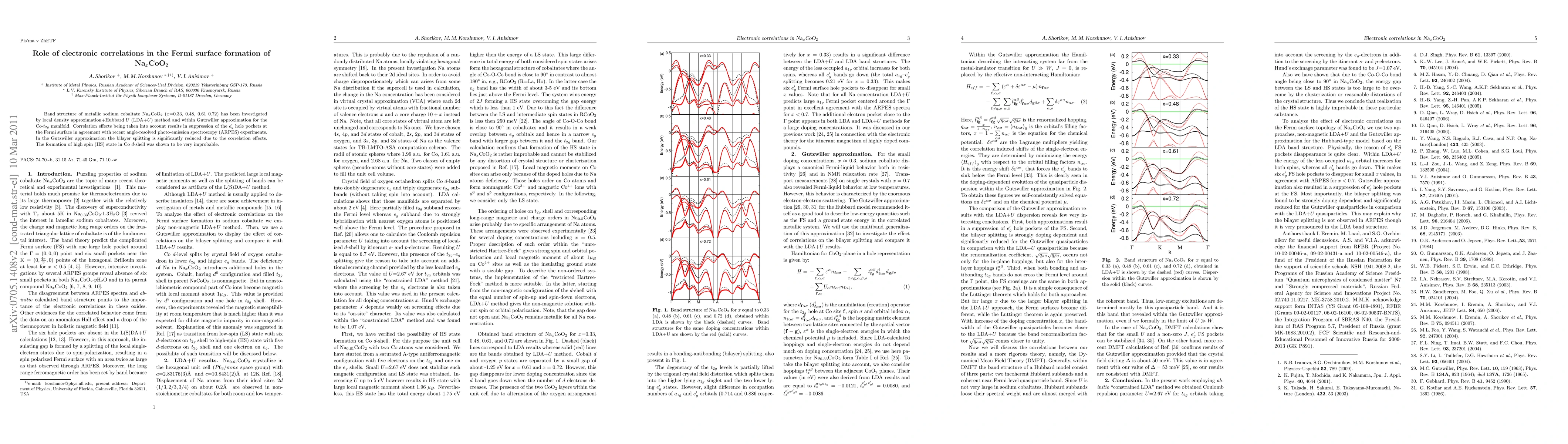 Band structure of metallic sodium cobaltate Na$_x$CoO$_2$ ($x$=0.33, 0.48, 0.61 0.72) has been investigated by local density approximation+Hubbard $U$ (LDA+$U$) method and within Gutzwiller approximation for the Co-$t_{2g}$ manifold. Correlation effects being taken into account results in suppression of the $e'_g$ hole pockets at the Fermi surface in agreement with recent angle-resolved photo-emission spectroscopy (ARPES) experiments. In the Gutzwiller approximation the bilayer splitting is significantly reduced due to the correlation effects. The formation of high spin (HS) state in Co $d$-shell was shown to be very improbable.