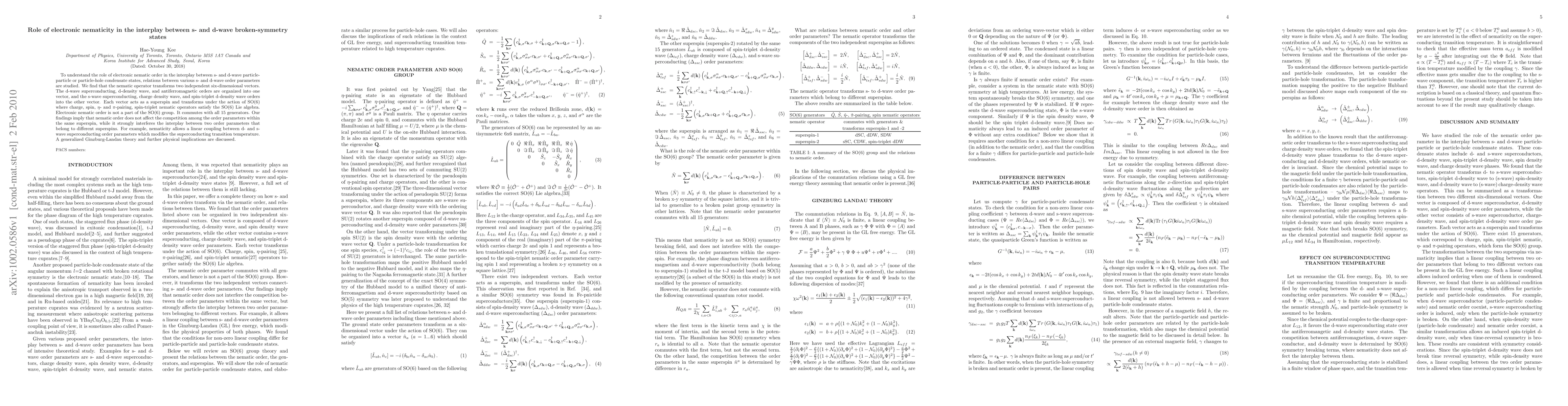 To understand the role of electronic nematic order in the interplay between s- and d-wave particle-particle or particle-hole condensate states, relations between various s- and d-wave order parameters are studied. We find that the nematic operator transforms two independent six-dimensional vectors. The d-wave superconducting, d-density wave, and antiferromagnetic orders are organized into one vector, and the s-wave superconducting, charge density wave, and spin-triplet d-density wave orders into the other vector. Each vector acts as a superspin and transforms under the action of SO(6) where charge, spin, eta- and pi-pairing, spin-triplet nematic operators satisfy the SO(6) Lie algebra. Electronic nematic order is not a part of the SO(6) group. It commutes with all 15 generators. Our findings imply that nematic order does not affect the competition among the order parameters within the same superspin, while it strongly interferes the interplay between two order parameters that belong to different superspins. For example, nematicity allows a linear coupling between d- and s-wave superconducting order parameters which modifies the superconducting transition temperature. A generalized Ginzburg-Landau theory and further physical implications are discussed.