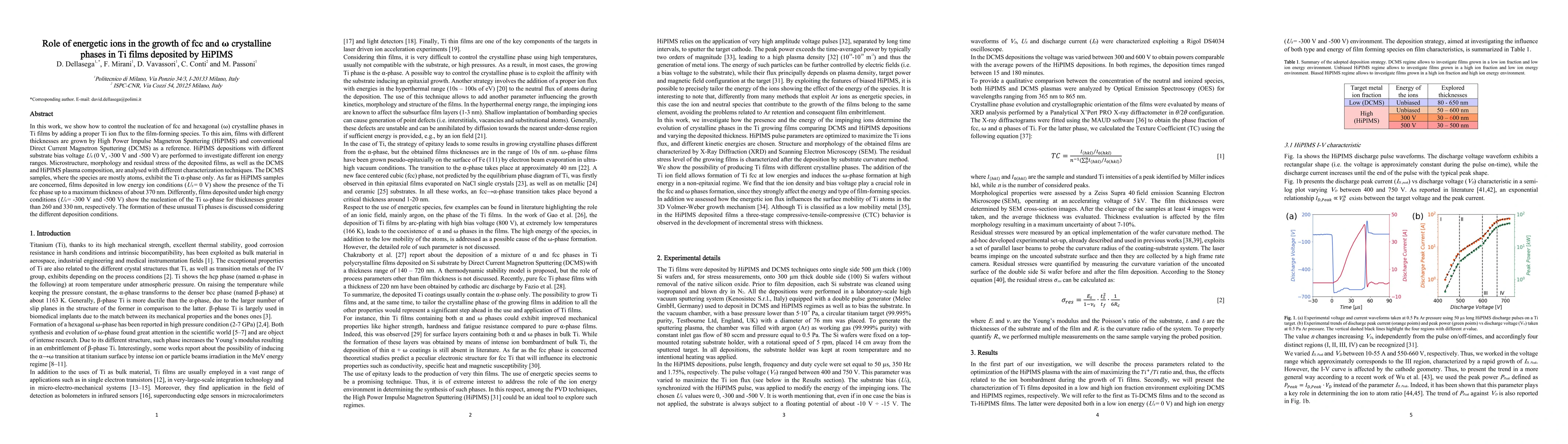 Titanium (Ti), due to its excellent properties, is widely exploited in thin film technology that usually leads to the production of {\alpha}-phase (hcp) Ti films. In this work, we investigate the phase evolution of Ti films deposited by varying type and energy of the film-forming species. To investigate different plasma species environments, films with different thicknesses are grown by using conventional Direct Current Magnetron Sputtering (DCMS) and High Power Impulse Magnetron Sputtering (HiPIMS). Furthermore, HiPIMS depositions with different substrate bias voltage US (0 V, -300 V and -500 V) are performed to investigate different ion energy ranges. Microstructure, morphology and residual stress of the deposited films, as well as the DCMS and HiPIMS plasma composition, are analysed with different characterization techniques. The DCMS samples exhibit the Ti {\alpha}-phase only and show a tensile residual stress decreasing with thickness. As far as HiPIMS samples are concerned, a compressive-tensile-compressive (CTC) behavior is observed for residual stresses as thickness increases. Specifically, films deposited in low energy ion conditions (US =0 V) show the presence of the Ti fcc phase up to a maximum thickness of about 370 nm. Differently, films deposited under high energy conditions (US = -300 V and -500 V) show the nucleation of the Ti {\omega}-phase for thicknesses greater than 260 and 330 nm, respectively. The formation of these unusual Ti phases is discussed considering the different deposition conditions.