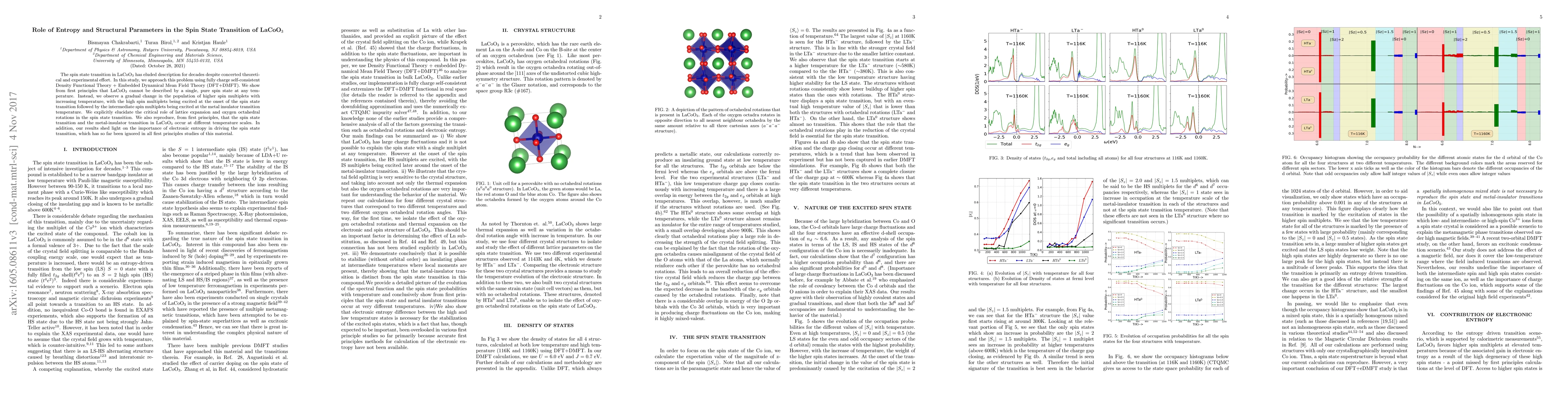 The spin state transition in LaCoO$_3$ has eluded description for decades despite concerted theoretical and experimental effort. In this study, we approach this problem using fully charge self-consistent Density Functional Theory + Embedded Dynamical Mean Field Theory (DFT+DMFT). We show from first principles that LaCoO$_3$ cannot be described by a single, pure spin state at any temperature. Instead, we observe a gradual change in the population of higher spin multiplets with increasing temperature, with the high spin multiplets being excited at the onset of the spin state transition followed by the intermediate spin multiplets being excited at the metal insulator transition temperature. We explicitly elucidate the critical role of lattice expansion and oxygen octahedral rotations in the spin state transition. We also reproduce, from first principles, that the spin state transition and the metal-insulator transition in LaCoO$_3$ occur at different temperature scales. In addition, our results shed light on the importance of electronic entropy in driving the spin state transition, which has so far been ignored in all first principles studies of this material.