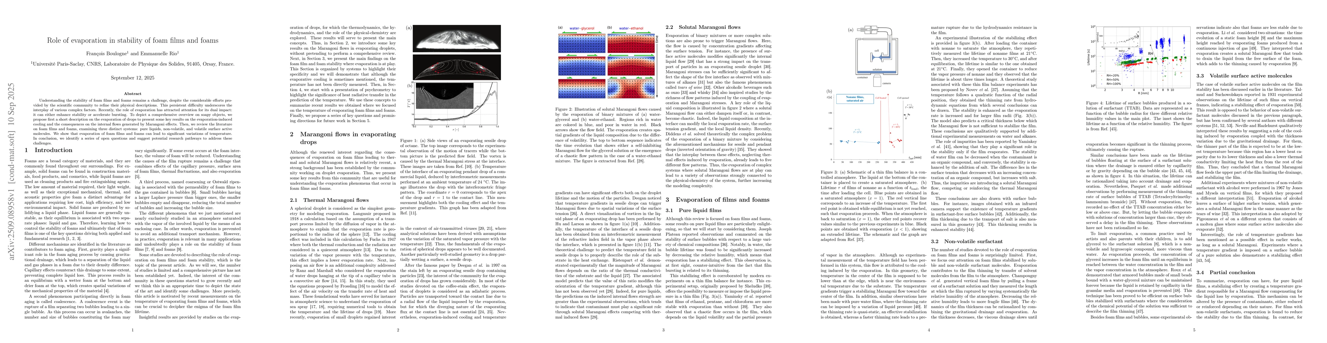 Understanding the stability of foam films and foams remains a challenge, despite the considerable efforts provided by the scientific community to refine their physical descriptions. This persistent difficulty underscores the interplay of various complex factors. Recently, the role of evaporation has attracted attention for its dual impact: it can either enhance stability or accelerate bursting. To depict a comprehensive overview on soapy objects, we propose first a short description on the evaporation of drops to present some key results on the evaporation-induced cooling and the consequences on the internal flows generated by Marangoni effects. Then, we review the literature on foam films and foams, examining three distinct systems: pure liquids, non-volatile, and volatile surface active molecules. We show that evaporation of foam films and foams can lead to significant variations of temperature. In conclusion, we identify a series of open questions and suggest potential research pathways to address these challenges.