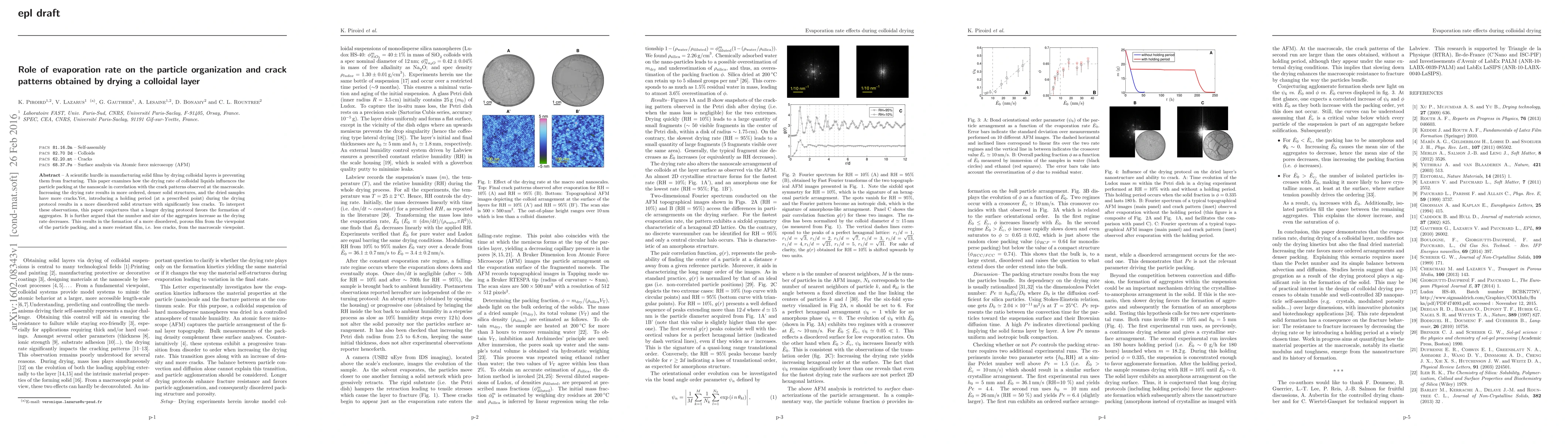 This paper investigates how varying drying rates affect the nanoscale particle packing and macroscale crack patterns in colloidal layers. Faster drying rates lead to denser, more ordered structures with more cracks, while a holding period during drying results in a more disordered, porous film with fewer cracks.