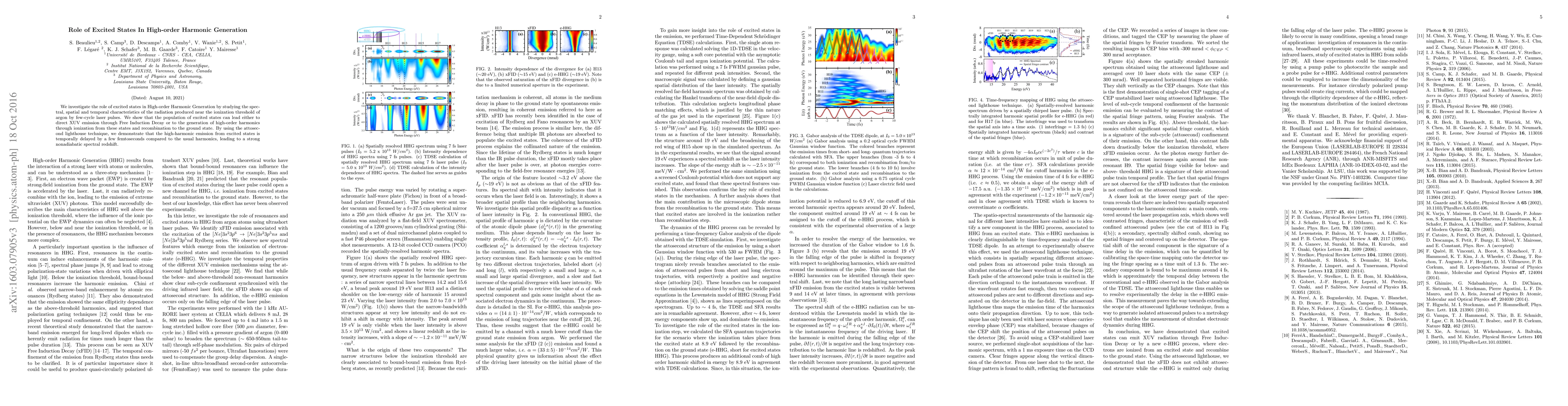 This paper explores how excited states in argon atoms influence high-order harmonic generation using few-cycle laser pulses, revealing that these states can produce XUV emission or high-order harmonics through ionization and recombination, with the latter showing a temporal delay and spectral redshift.
