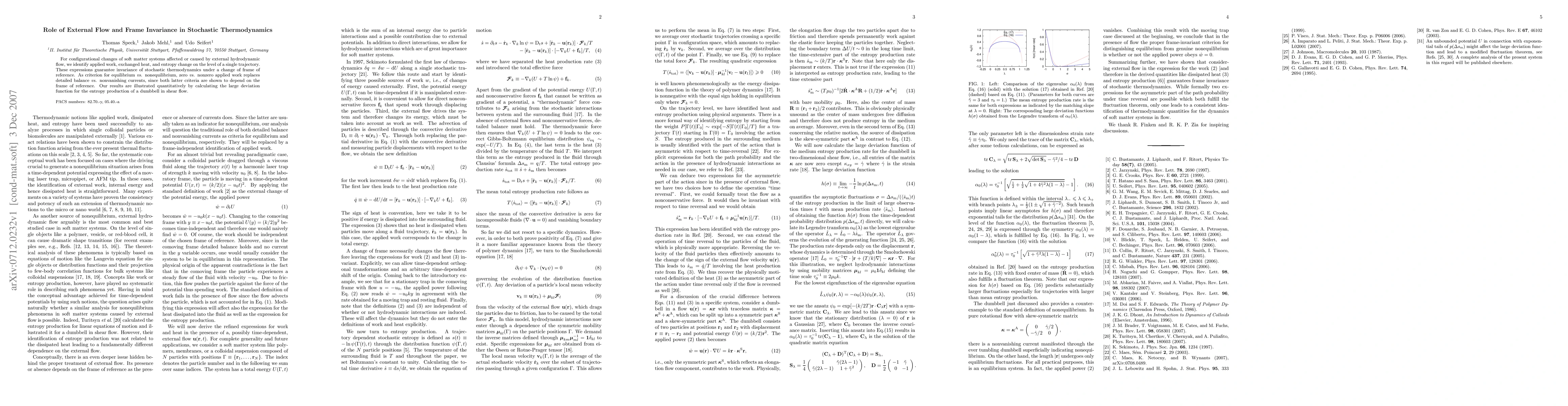 For configurational changes of soft matter systems affected or caused by external hydrodynamic flow, we identify applied work, exchanged heat, and entropy change on the level of a single trajectory. These expressions guarantee invariance of stochastic thermodynamics under a change of frame of reference. As criterion for equilibrium \textit{vs.} nonequilibrium, zero \textit{vs.} nonzero applied work replaces detailed balance \textit{vs.} nonvanishing currents, since both latter criteria are shown to depend on the frame of reference. Our results are illustrated quantitatively by calculating the large deviation function for the entropy production of a dumbbell in shear flow.