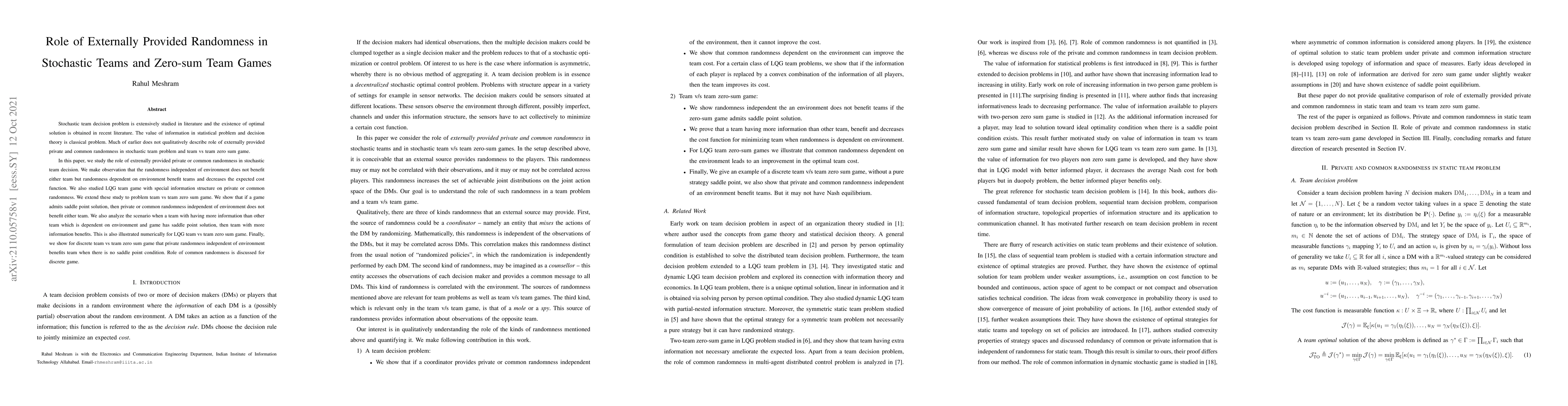 Stochastic team decision problem is extensively studied in literature and the existence of optimal solution is obtained in recent literature. The value of information in statistical problem and decision theory is classical problem. Much of earlier does not qualitatively describe role of externally provided private and common randomness in stochastic team problem and team vs team zero sum game. In this paper, we study the role of extrenally provided private or common randomness in stochastic team decision. We make observation that the randomness independent of environment does not benefit either team but randomness dependent on environment benefit teams and decreases the expected cost function. We also studied LQG team game with special information structure on private or common randomness. We extend these study to problem team vs team zero sum game. We show that if a game admits saddle point solution, then private or common randomness independent of environment does not benefit either team. We also analyze the scenario when a team with having more information than other team which is dependent on environment and game has saddle point solution, then team with more information benefits. This is also illustrated numerically for LQG team vs team zero sum game. Finally, we show for discrete team vs team zero sum game that private randomness independent of environment benefits team when there is no saddle point condition. Role of common randomness is discussed for discrete game.