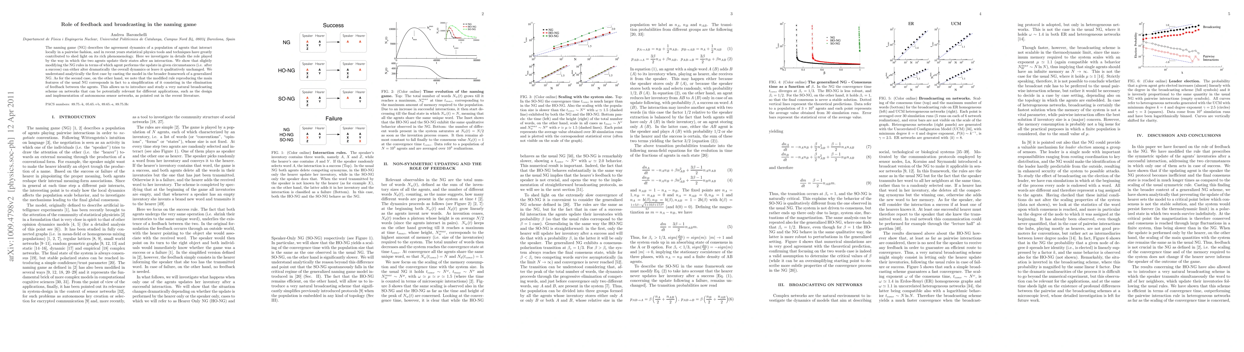 The naming game (NG) describes the agreement dynamics of a population of agents that interact locally in a pairwise fashion, and in recent years statistical physics tools and techniques have greatly contributed to shed light on its rich phenomenology. Here we investigate in details the role played by the way in which the two agents update their states after an interaction. We show that slightly modifying the NG rules in terms of which agent performs the update in given circumstances (i.e. after a success) can either alter dramatically the overall dynamics or leave it qualitatively unchanged. We understand analytically the first case by casting the model in the broader framework of a generalized NG. As for the second case, on the other hand, we note that the modified rule reproducing the main features of the usual NG corresponds in fact to a simplification of it consisting in the elimination of feedback between the agents. This allows us to introduce and study a very natural broadcasting scheme on networks that can be potentially relevant for different applications, such as the design and implementation of autonomous sensor networks, as pointed out in the recent literature.