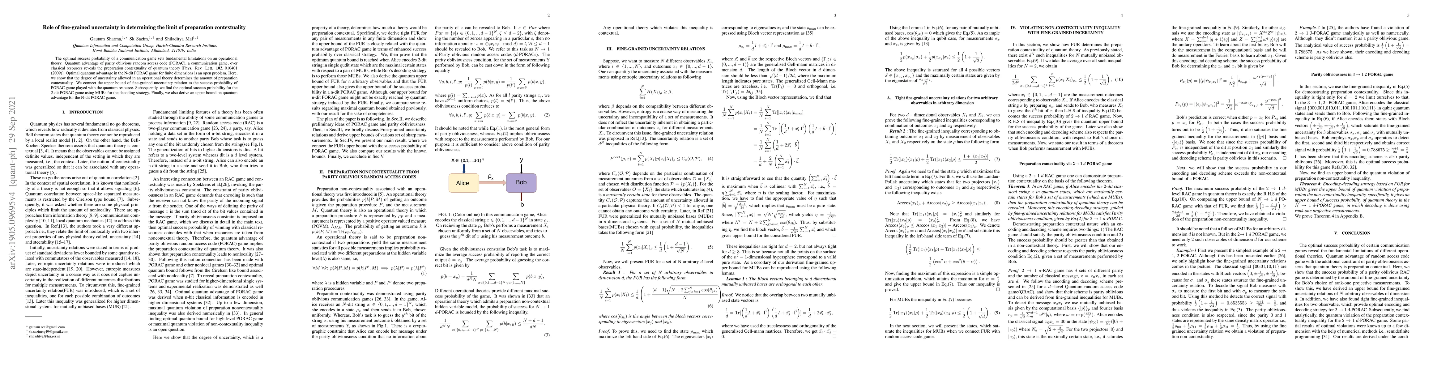 This paper investigates the link between fine-grained uncertainty and preparation contextuality in quantum theory, focusing on the optimal success probability of the parity oblivious random access code (PORAC) game. It finds that the degree of uncertainty influences the level of preparation contextuality and establishes an upper bound on the success probability for the 2-dit PORAC game using mutually unbiased bases (MUBs), and an upper bound on quantum advantage for the N-dit PORAC game.